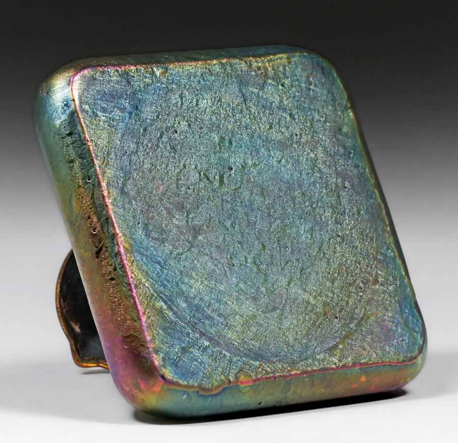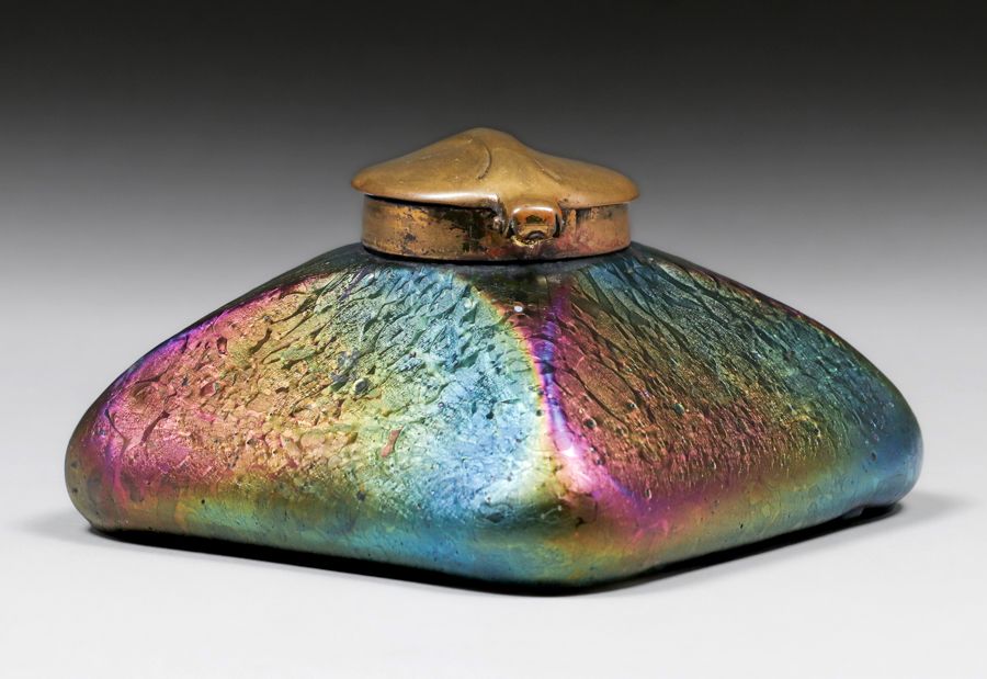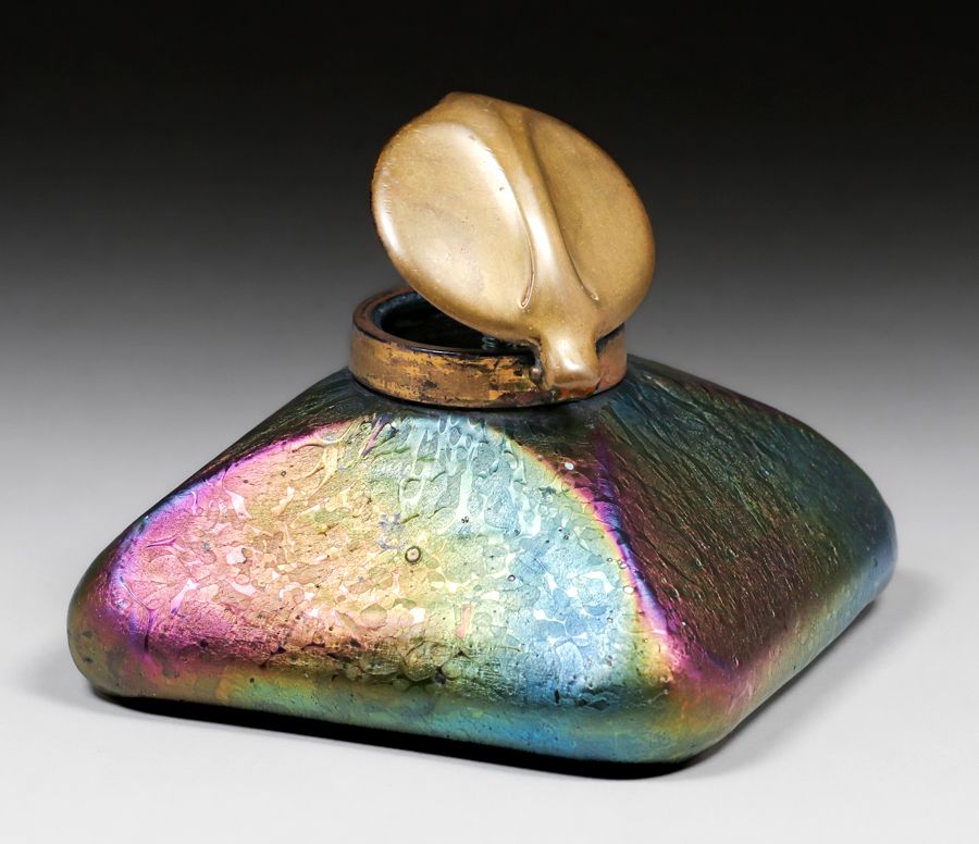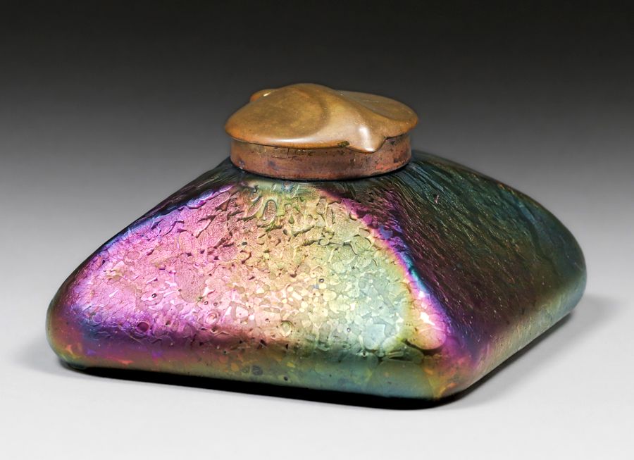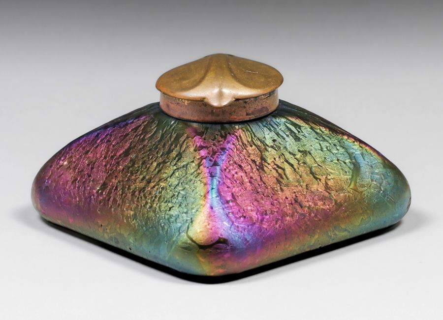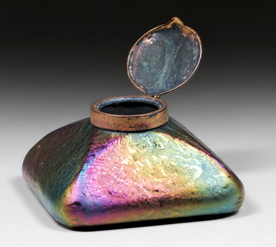 Loetz Art Glass Inkwell c1905. Unsigned. Missing glass insert, otherwise perfect condition. 4.75" x 4.75" x 2.75"h SOLD