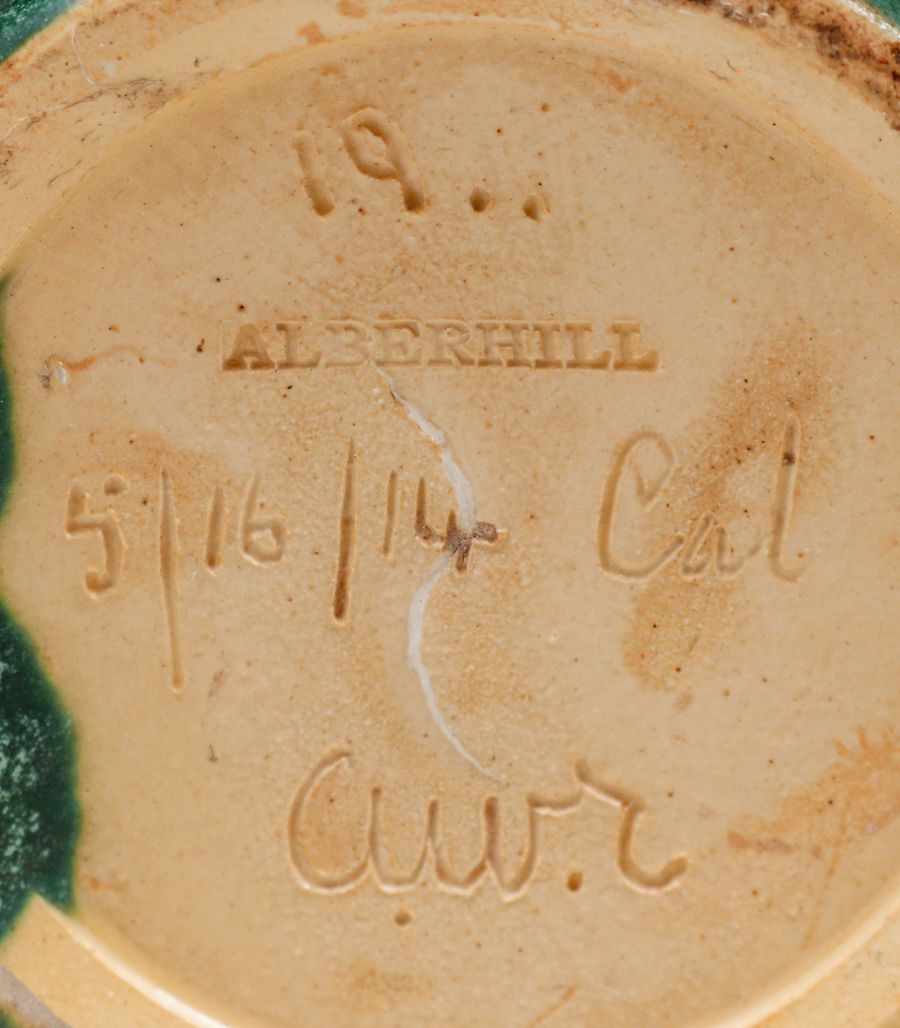 Alberhill Pottery – Alexander W. Robertson Matte Green Two-Handled Vase 1914. Located in rural Riverside County, Alberhill represented some of the finest clay deposits in California. This short lived Art Pottery began in 1913 and ceased in 1914. Robertson and Alberhill won a Gold Medal at the 1915 San Francisco Panama Pacific International Exhibition. Signed. Dated 5/16 1914. Perfect condition. 6”h x 5”w $7500