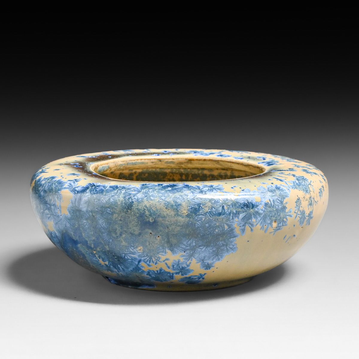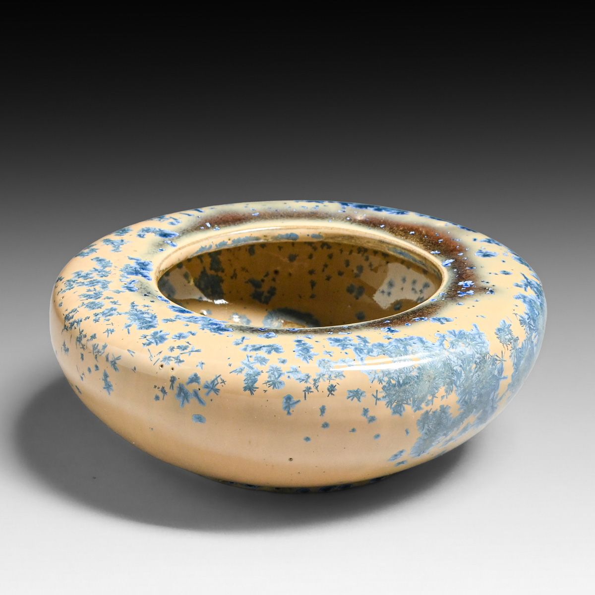 American Encaustic Tile Co - AETCO Blue Crystalline Squat Vase c1920s. Unsigned. Perfect condition. 6"d x 2.25"h