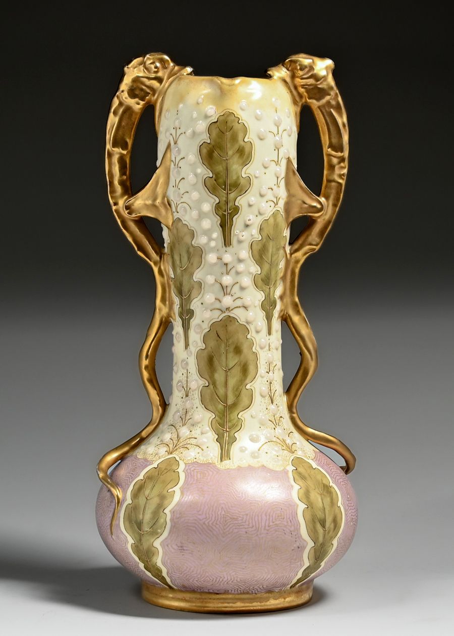 - Tall Amphora Pottery Two-Handled Jeweled Vase c1900