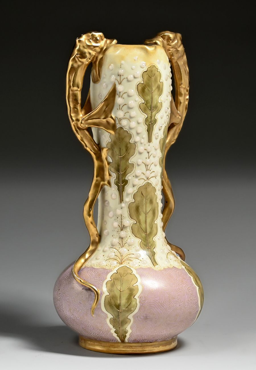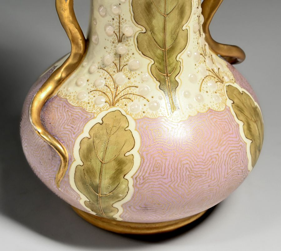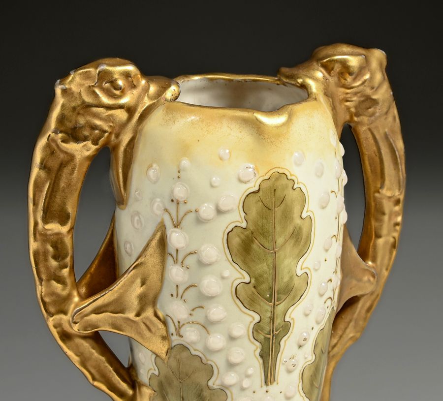 Tall Amphora Pottery Two-Handled Jeweled Vase c1900. Signed. Invisible professional restoration to lower handle, otherwise perfect condition. 15.25"h x 7"w $1200