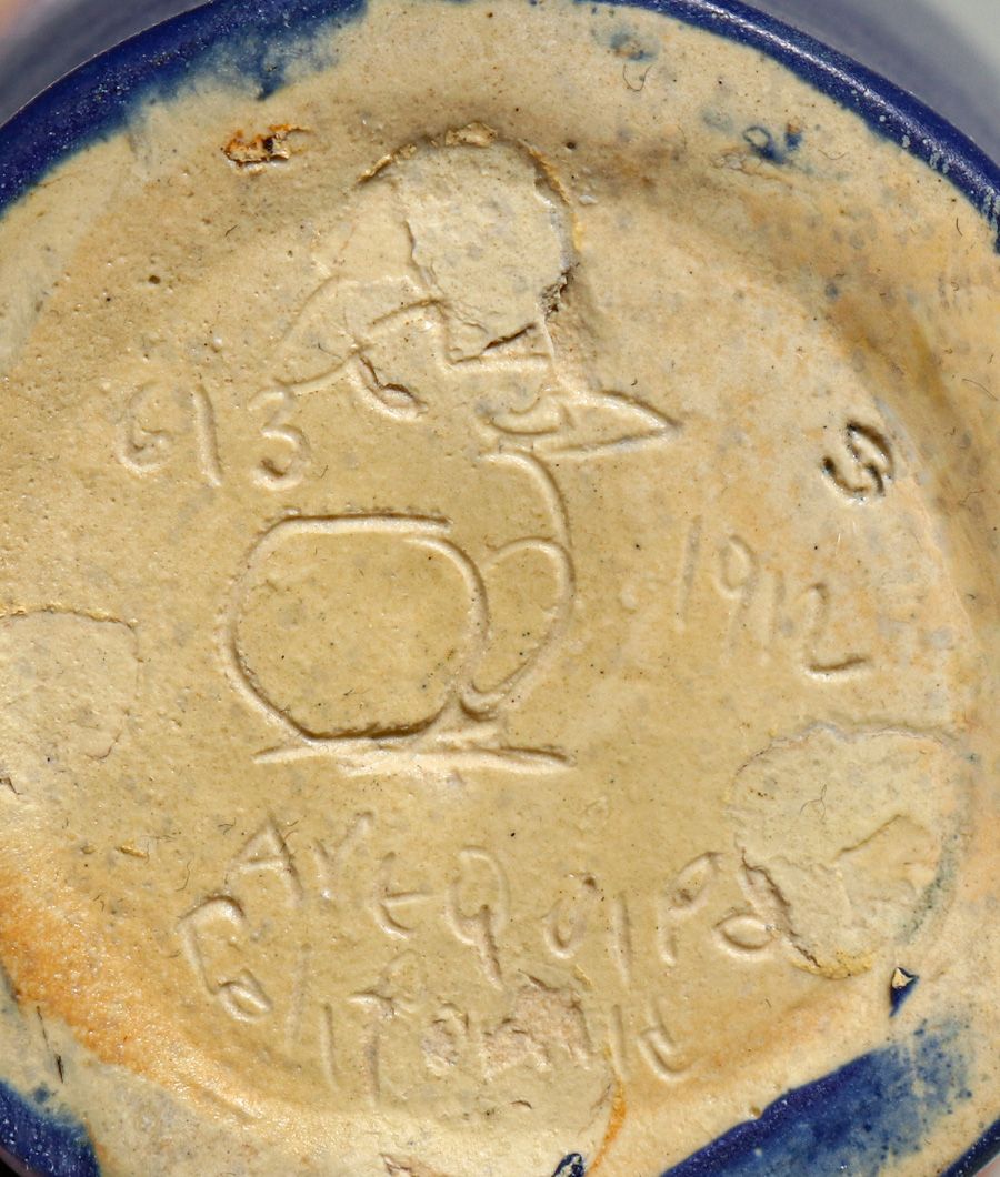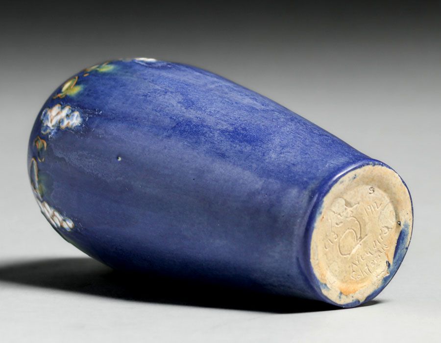 Arequipa Pottery Frederick Rhead Squeeze-Bag Decorated Grape Cluster Vase 1912. Signed. Invisible professional restoration to small grinding chip, otherwise perfect condition. 6”h x 3”d $9500