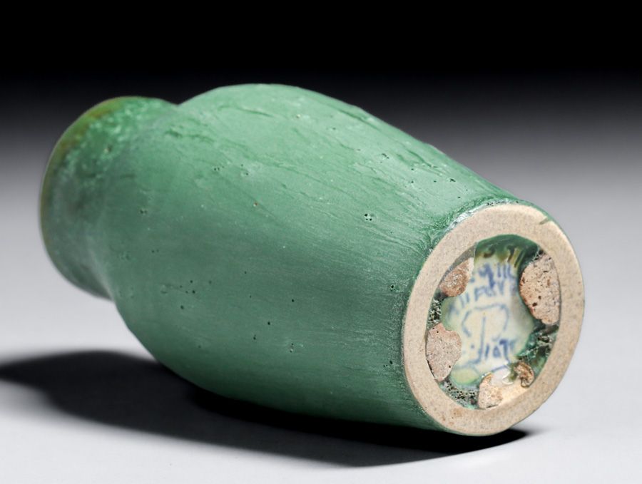 Arequipa Pottery Matte Green Vase c1911-1912. Signed with earliest mark. Invisible professional restoration to small base chip, otherwise perfect condition. 5.25"h x 2.5"d SOLD