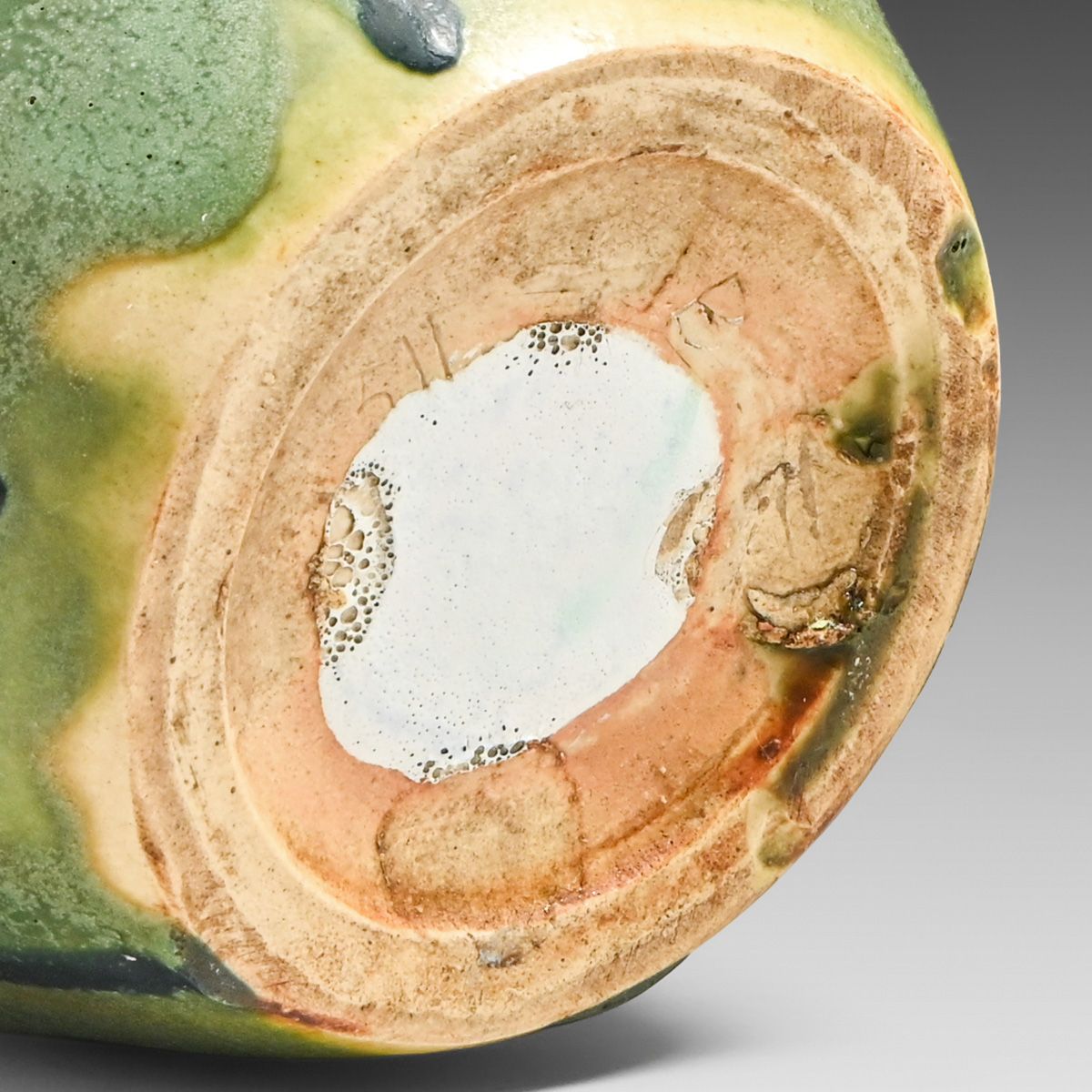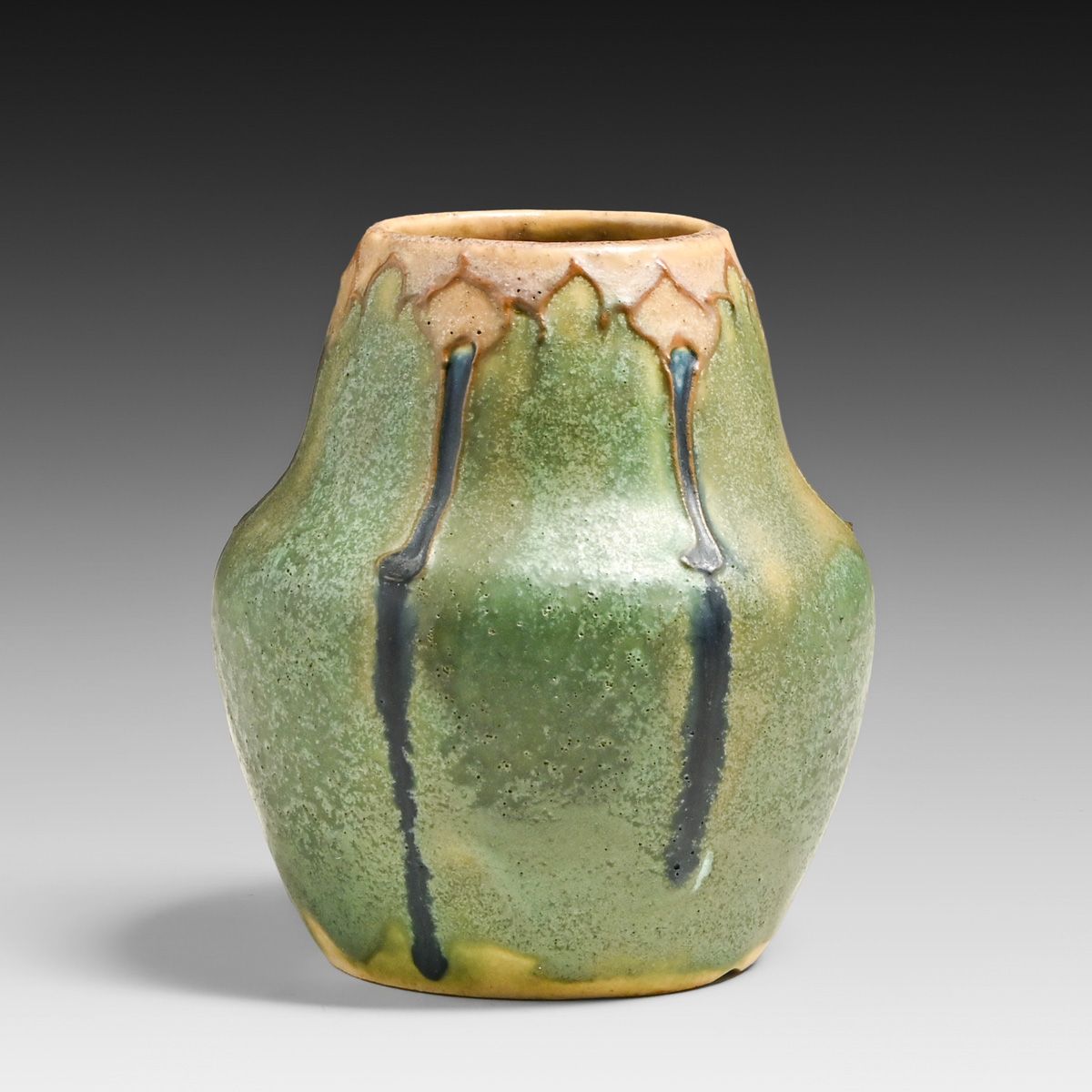 Rare Arequipa Pottery Frederick Hurten Rhead Squeeze-Bag Decorated Vase c1912. Signed faintly. Perfect condition. 6"h x 5.25"d. This is a great example of Rhead's work with a rich, matte green glaze and black linear stems below spades encircling the rim.