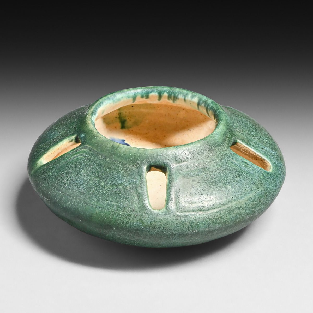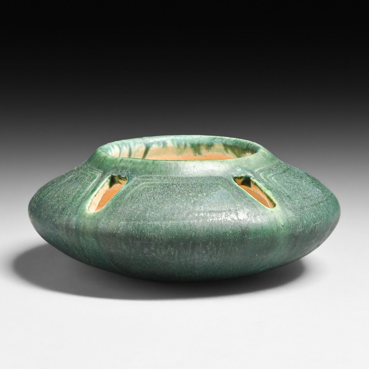 - Arts & Crafts Period Matte Green Cutout Studio Bowl c1910