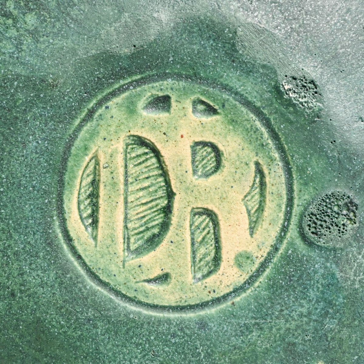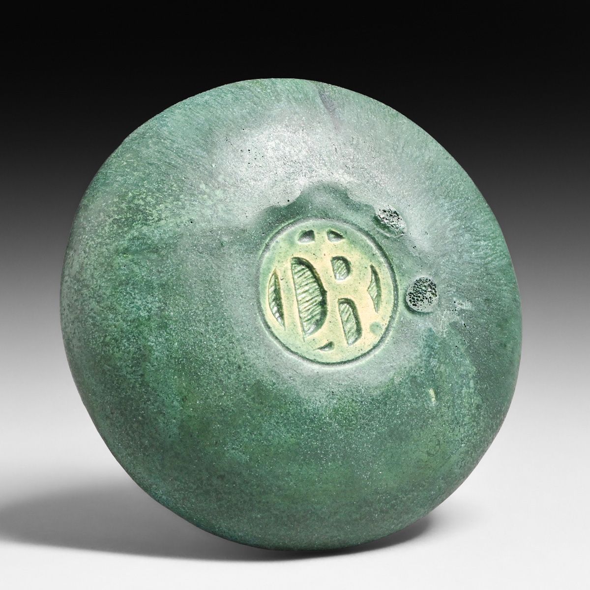 Arts & Crafts Period Matte Green Cutout Studio Bowl c1910. Signed "DB". Signature similar to Adelaide Robineau. Firing line in center of interior, otherwise perfect condition. 6.75"d x 3.5"h