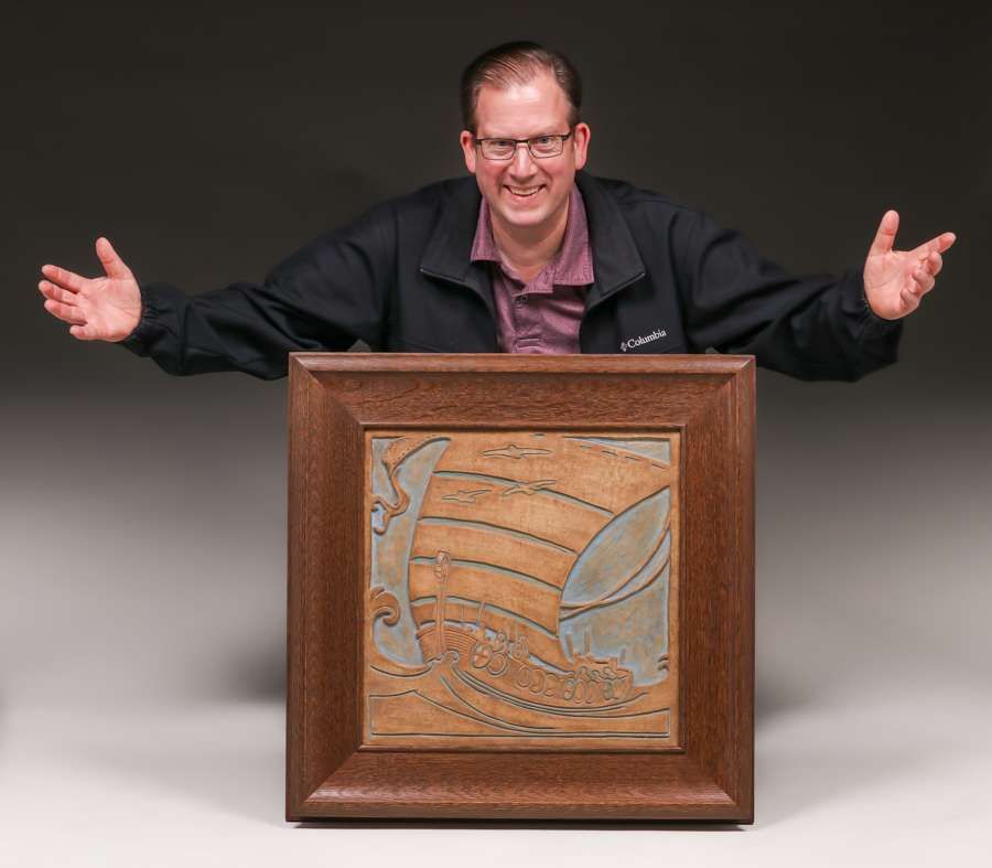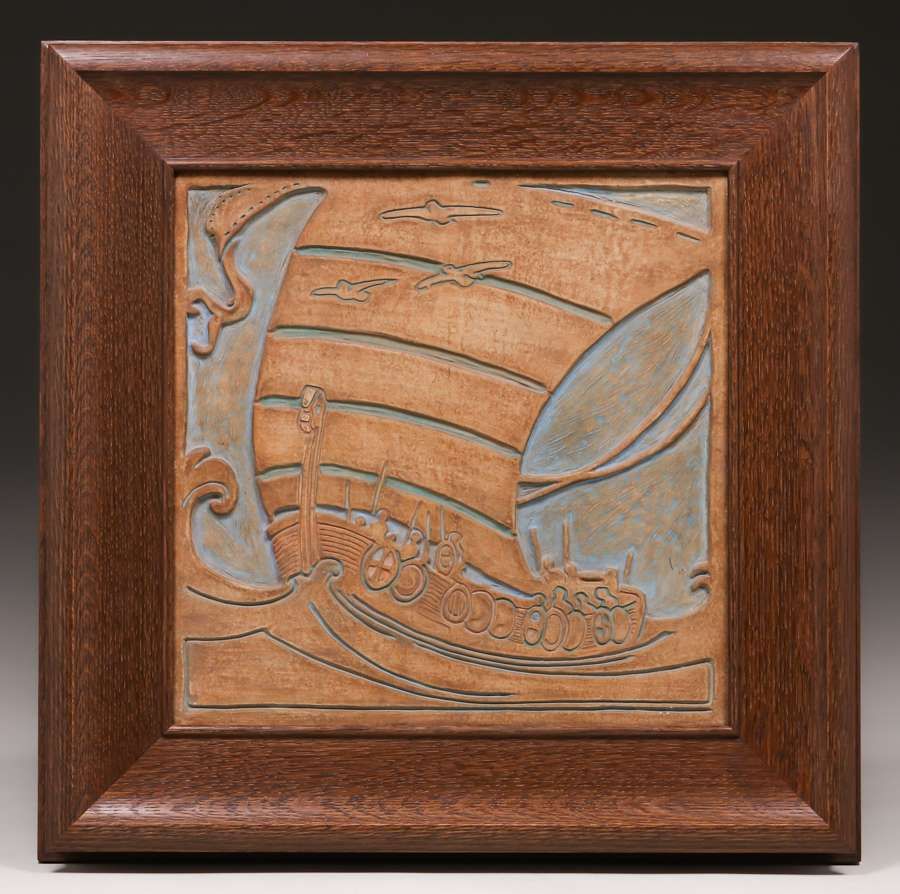 Largest Batchelder – Los Angeles Viking Ship Tile c1920. This is the largest known example of this tile. Signed. Perfect condition. 16″ x 16″. Tim Holton custom oak frame 25" x 25" SOLD