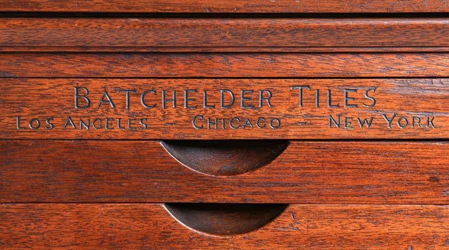 Rare Batchelder Seventy-Drawer Tile Cabinet c1920. Designed for the retailer of Batchelder Tiles. Carved in top center drawer "BATCHELDER TILES LOS ANGELES CHICAGO NEW YORK". Excellent original finish. 49.25"h x 49"w x 28.25"d SOLD