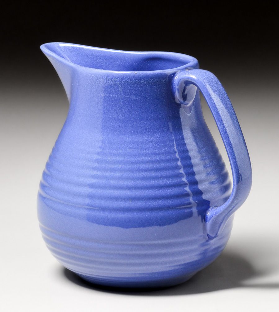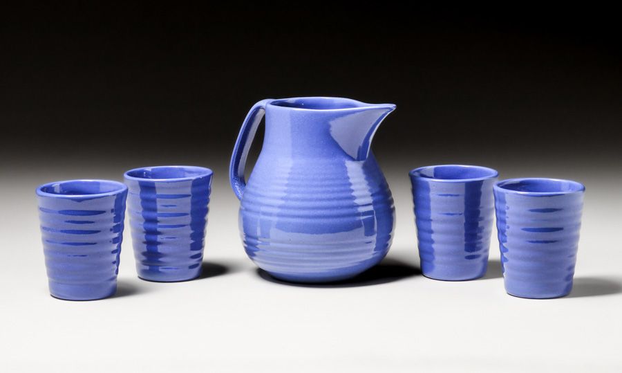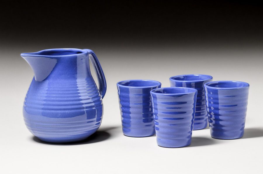 Bauer Pottery Blue Ringware Cider Set c1930s. Signed. Perfect condition. Pitcher 8"h x 6.5"d. Tumblers 4.75"h x 3.5"d SOLD