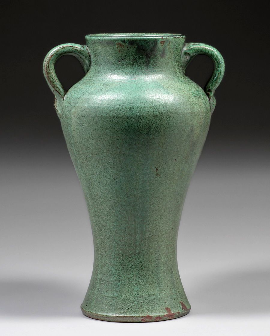 Early Bauer "Rebekah" Matte Green Two-Handled Matt Carlton Vase c1915. Unsigned (all of the hand thrown Matt Carlton vases were unsigned). Invisible professional restoration to a couple of small base chips, otherwise perfect condition. 14.5"h x 9"w SOLD