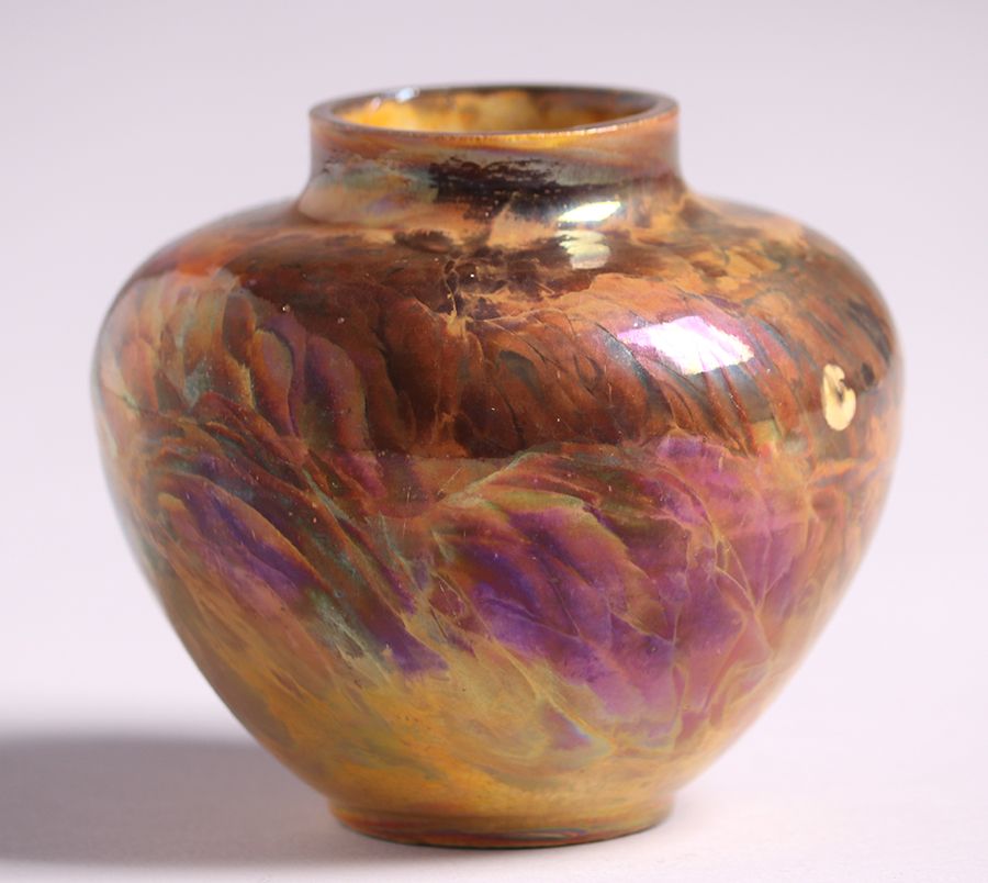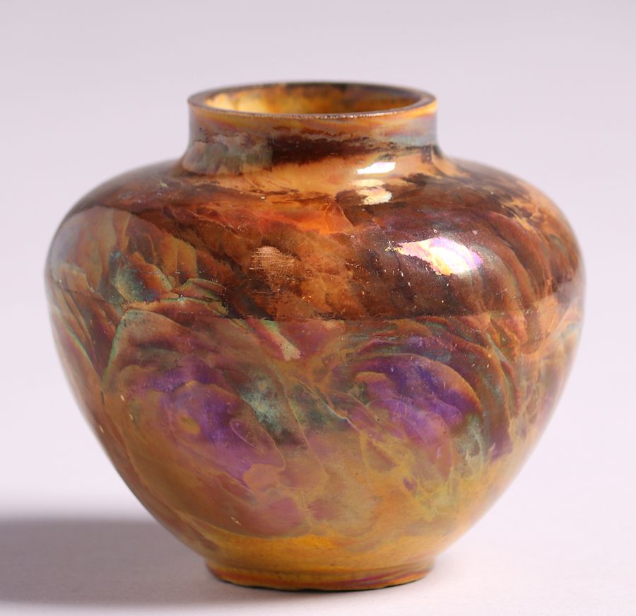Brouwer Middle Lane Pottery flame painted iridescent vase. Signed. Small fleck to edge of foot, otherwise perfect condition. 3.75"h x 3.75"d SOLD