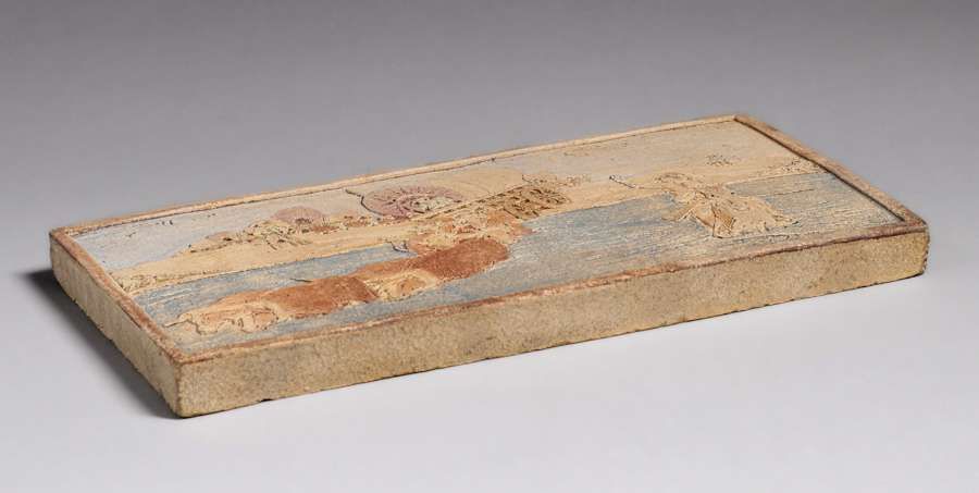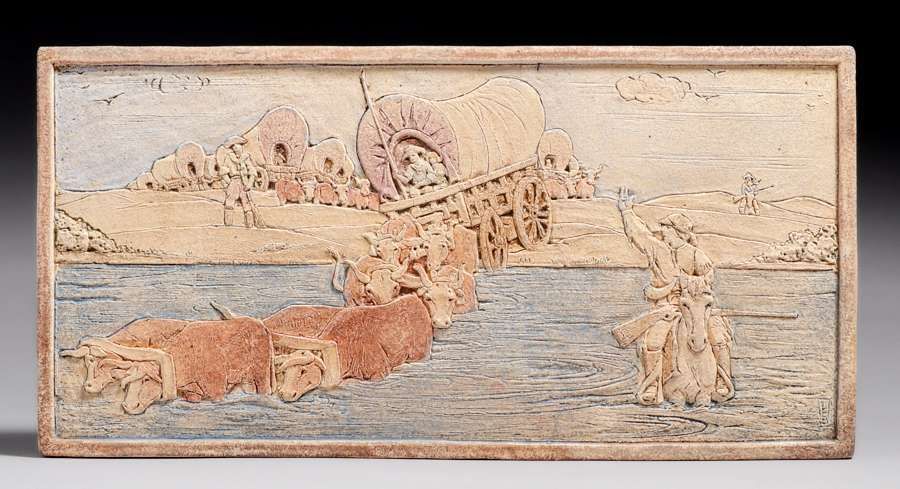 Cal Art - Richmond Scenic Wagon Tile c1920s. Signed. Invisible professional restoration to corners, otherwise perfect condition. 15.5"w x 7.75"h $2200
