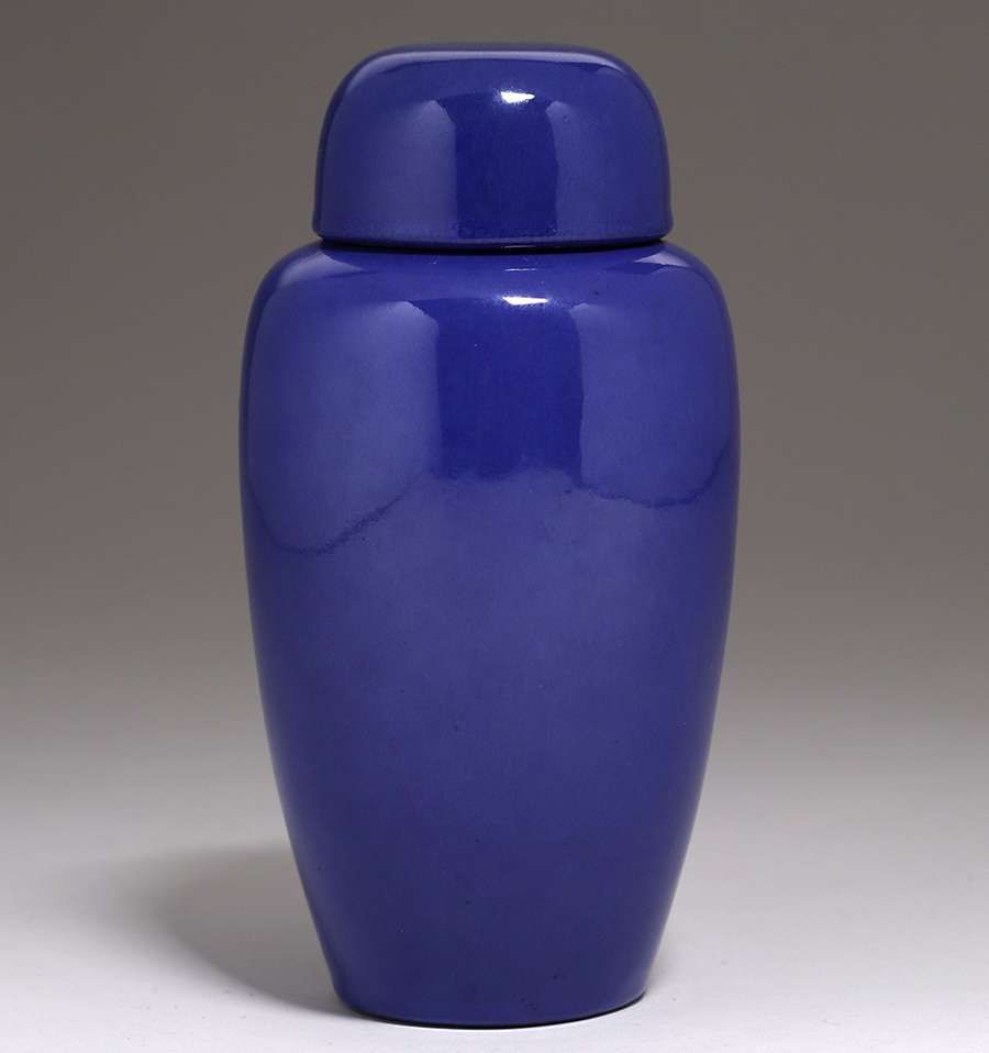 California Faience blue covered vase c1920s. Signed. Perfect condition. Kirby Brown Collection. 9"h x 4.5"d SOLD