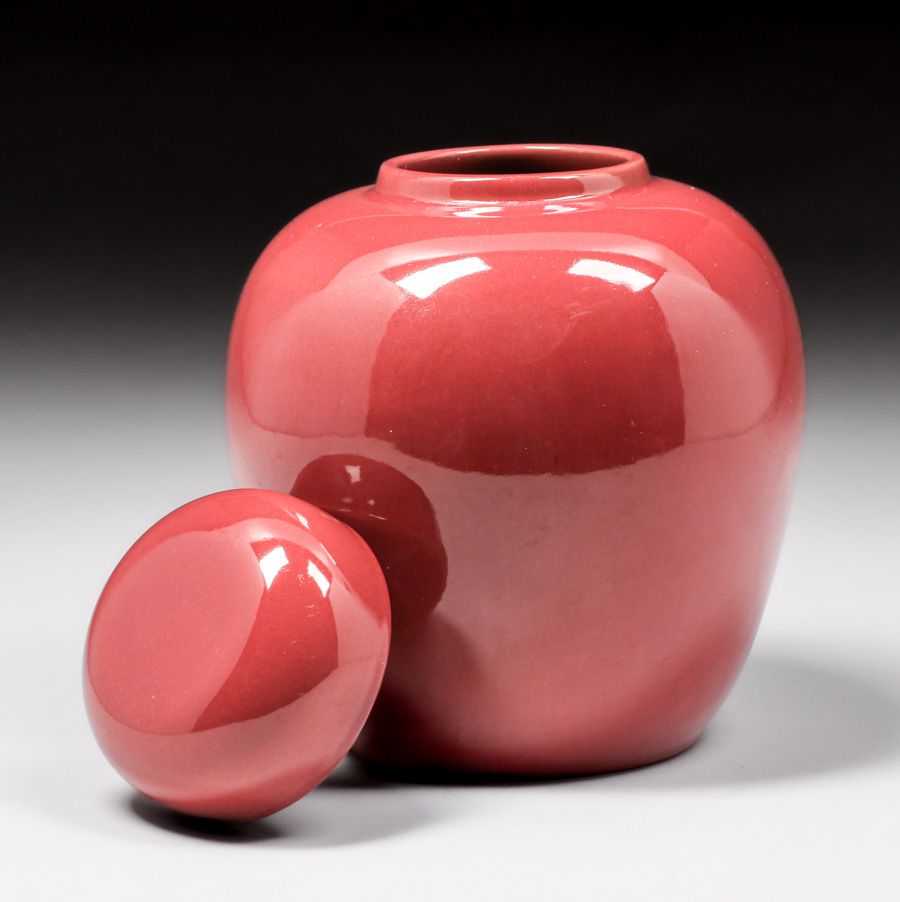 California Faience Burgundy Covered Ginger Jar c1920s. Retailed by Morcom's House of Beautiful Things Oakland. Signed. Perfect condition. 9"h x 6.5"d SOLD