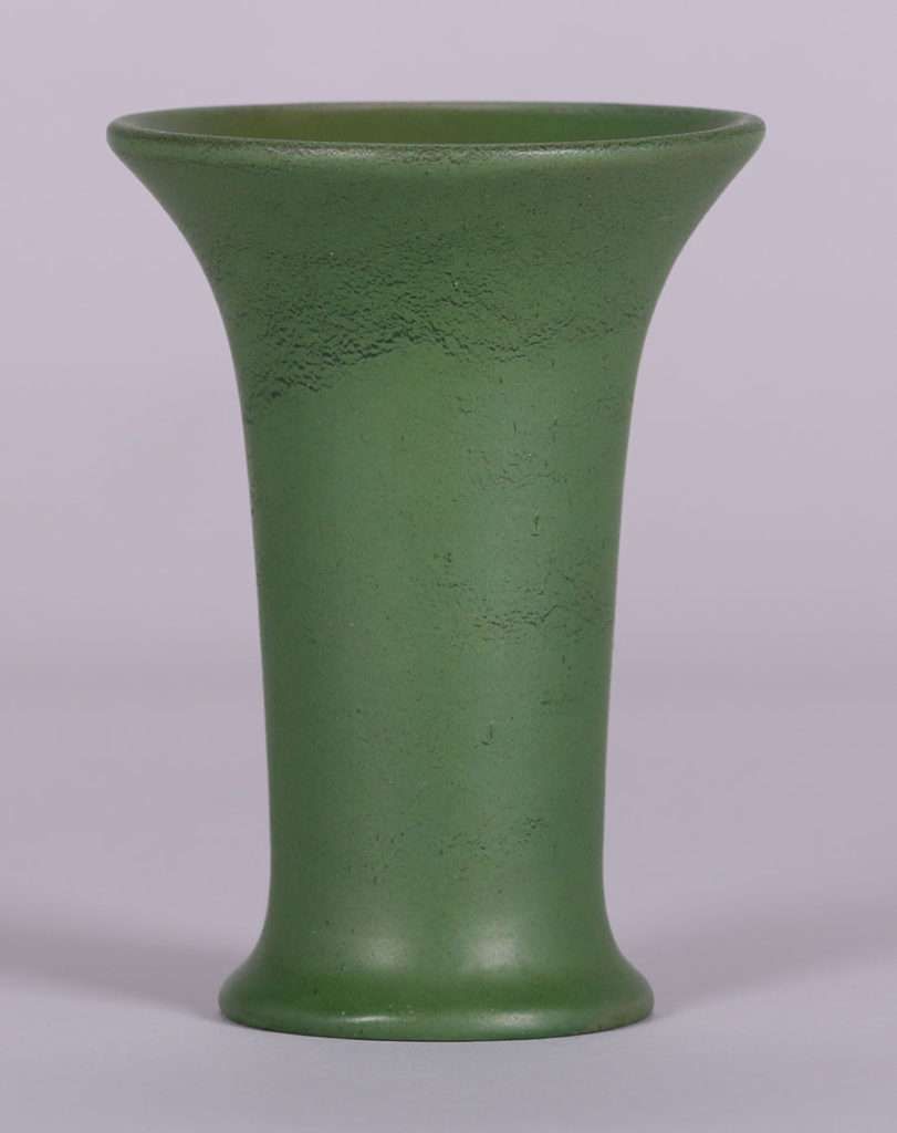 California Faience flared vase with a fantastic curdled matte green glaze. Invisible professional restoration to tight hairline, otherwise perfect condition. From the Collection of Kirby Brown. 7″h x 5″d SOLD
