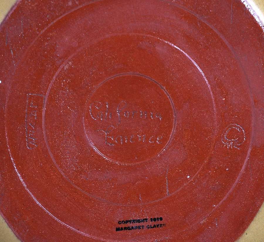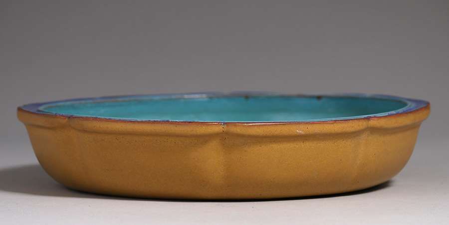 California Faience oval blue fruit bowl with matte mustard exterior glaze c1919. Signed. Invisible professional restoration to two small edge chips. 10.75" x 11.5" x 2"h SOLD