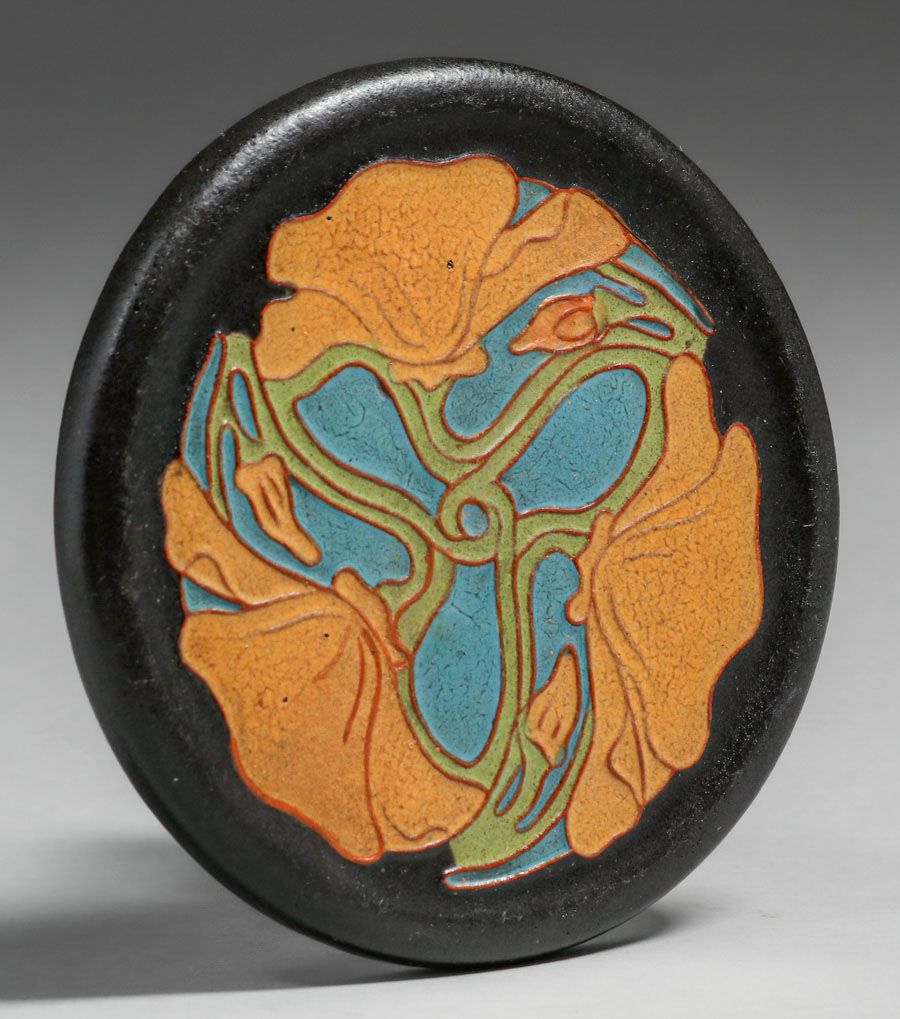 California Faience Matte Black Three Poppy Tile c1915-1920. Signed. Broken in half and professionally restored. 5.5″d SOLD
