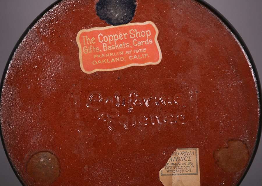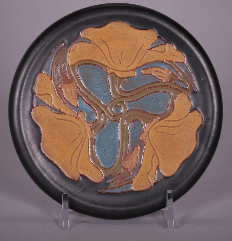 Exquisite California Faience matte glazed poppy tile. Signed with impressed mark, original Tile Shop paper label and The Copper Shop label. Perfect condition. 5.25"d SOLD