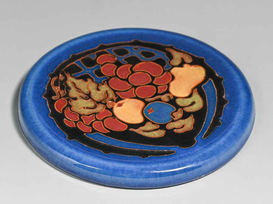 California Faience Multi-Colored Matte Fruit Basket Tile c1920. Signed. Perfect condition. 5.25d inches SOLD
