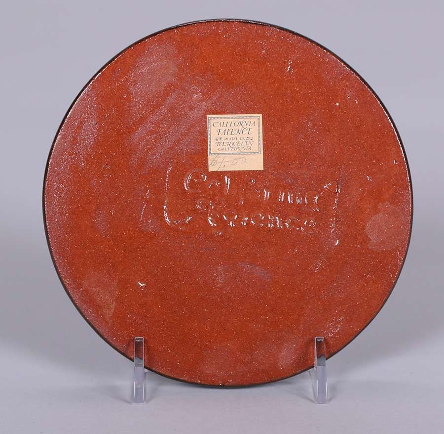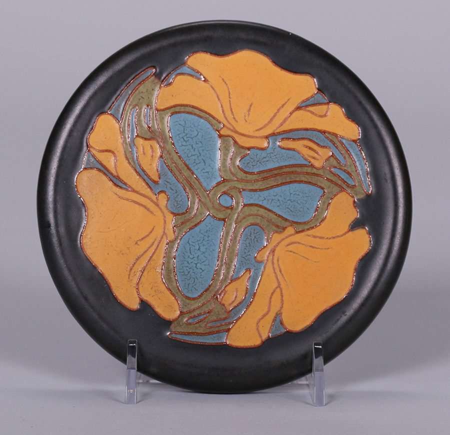 California Faience Poppy Tile with beautiful matte glazes. Signed and original paper label. Perfect condition. 5.25"d SOLD