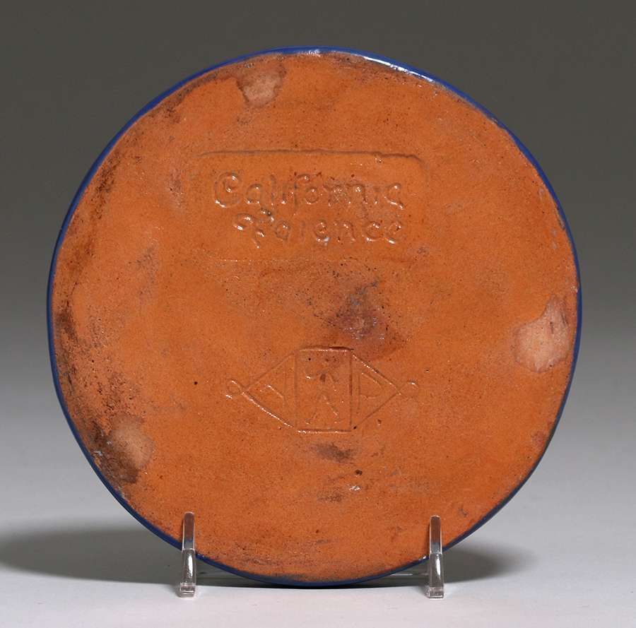 California Faience stylized floral tile c1930s. Signed “California Faience” and “AP” within a cipher. Surface edge wear, otherwise perfect condition. 5.75″d SOLD