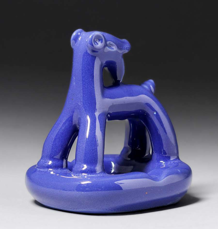 California Porcelain Art Deco Blue Glazed Figural Dog c1927-1929. Unsigned. A couple of glaze skips, otherwise perfect condition. 5.75″h x 5″ x 4″ SOLD