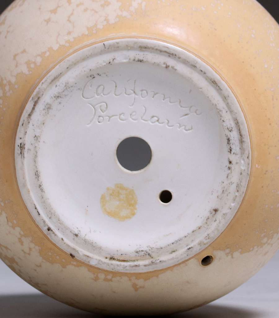 California Porcelain Matte Crystalline Vase c1927-1929. This is a great example of the matte crystalline glaze, originally developed by Chauncey Thomas when he studied at Alfred under Charles Binns. Signed. Factory drilled as lamp base. Perfect condition. From the Estate of Kirby Brown, author of the California Faience Book. 9.25″h x 6.5″d SOLD
