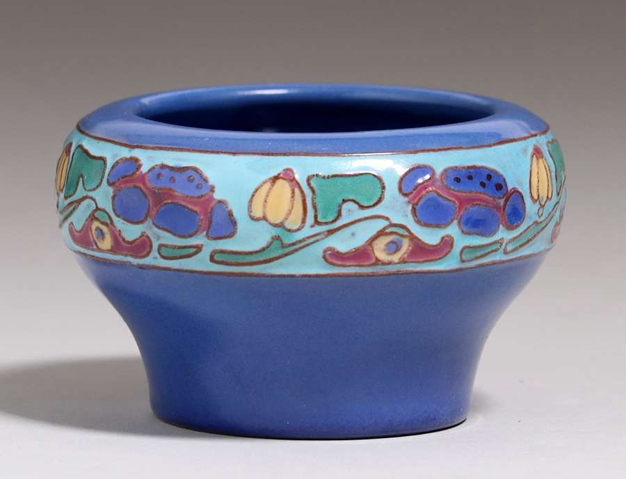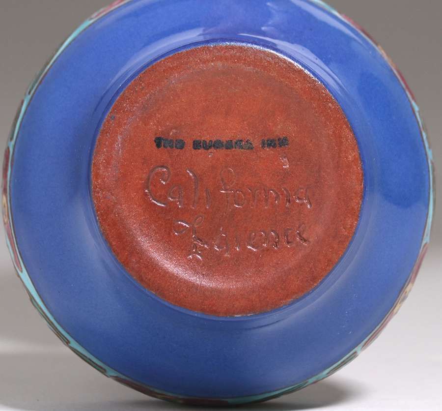 Rare California Faience decorated vase made for The Eureka Inn, Eureka, CA. Signed. Perfect condition. 4″d x 2.25″h SOLD