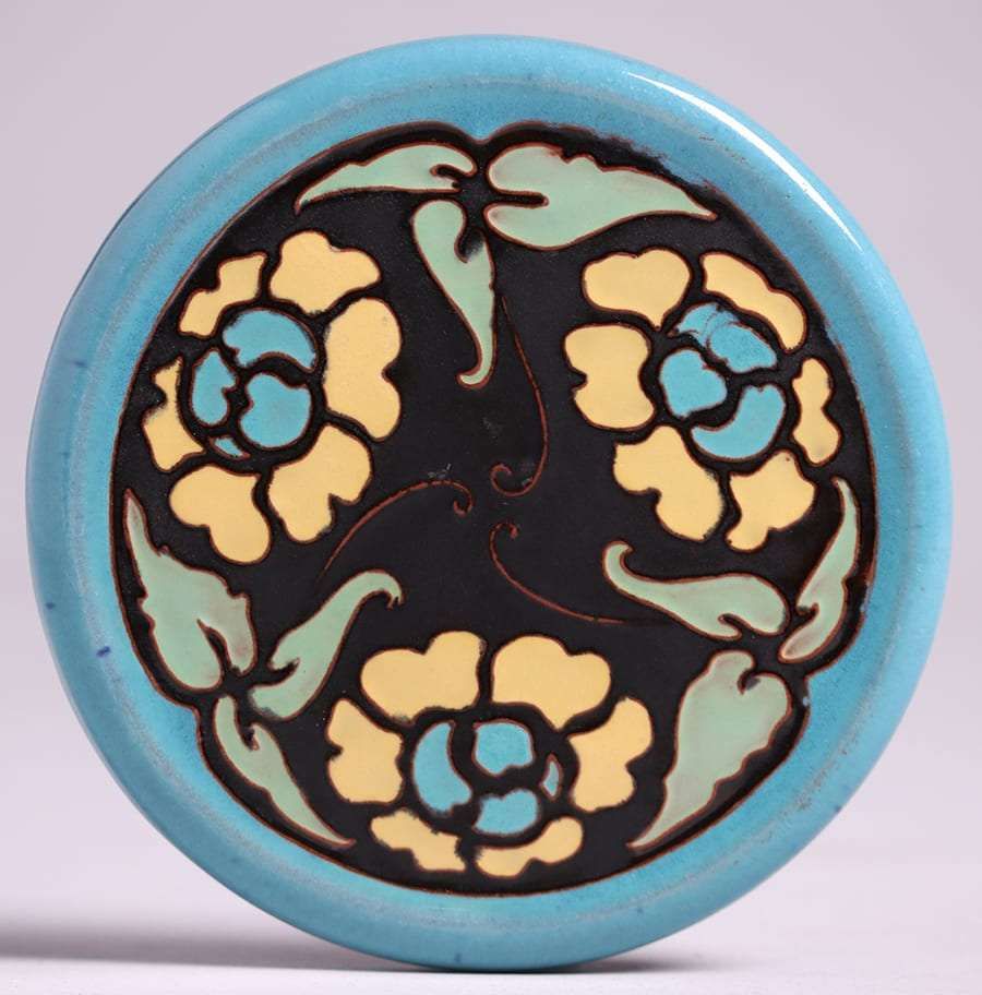 Rare California Faience tile with stylized six-petal flowers. Perfect condition. 5.25"d SOLD