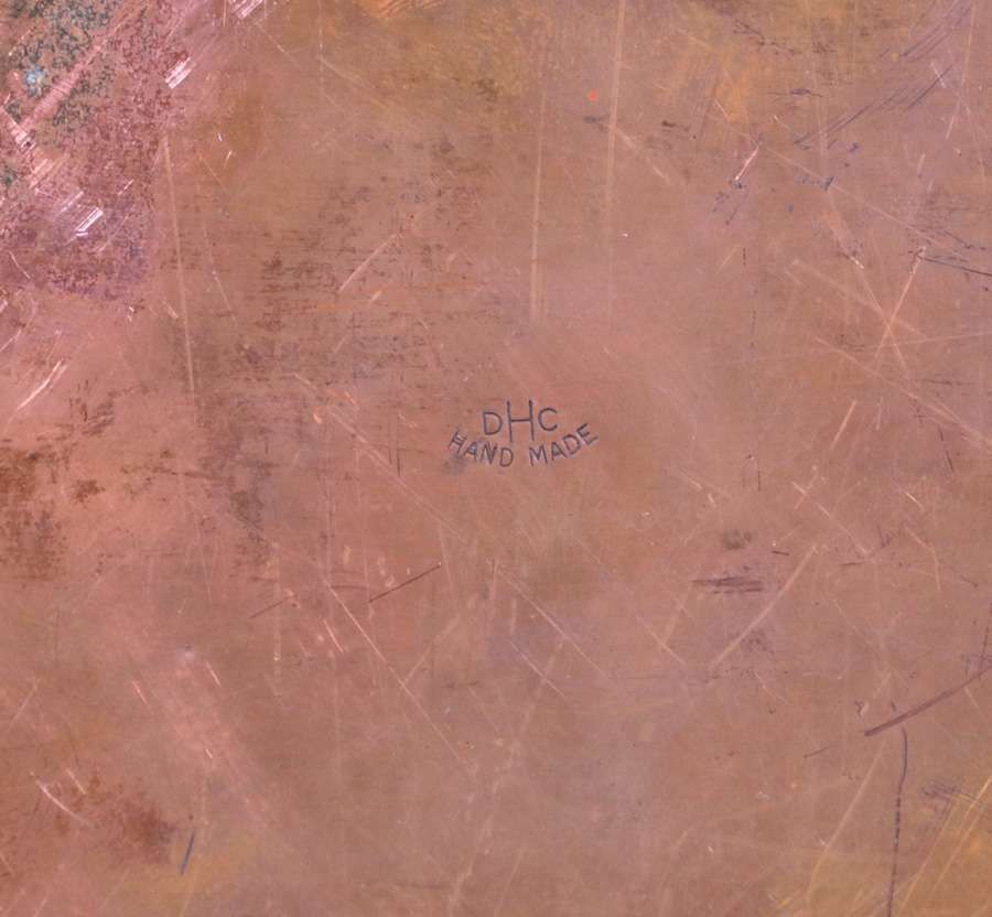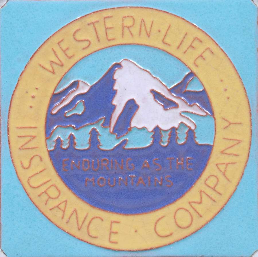 Arts & Crafts ceramic tile similar to California Faience in glaze and execution. Made by the Gila Bend Pottery Co of Arizona c1920s-1930s for The Western Life Insurance Company. Kirby Brown speculates that there may have been a connection between these two potteries and that the tiles may have even been made at California Faience. Perfect condition. Tile 6.25"sq. Copper frame 9.75"sq $450