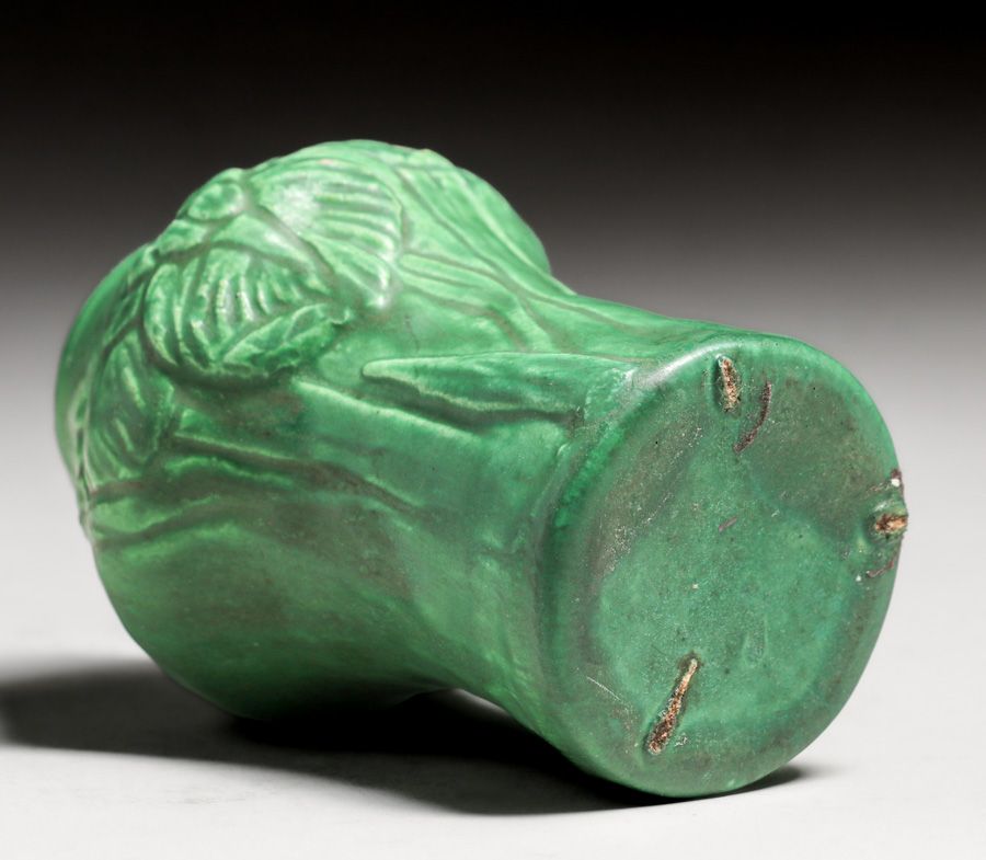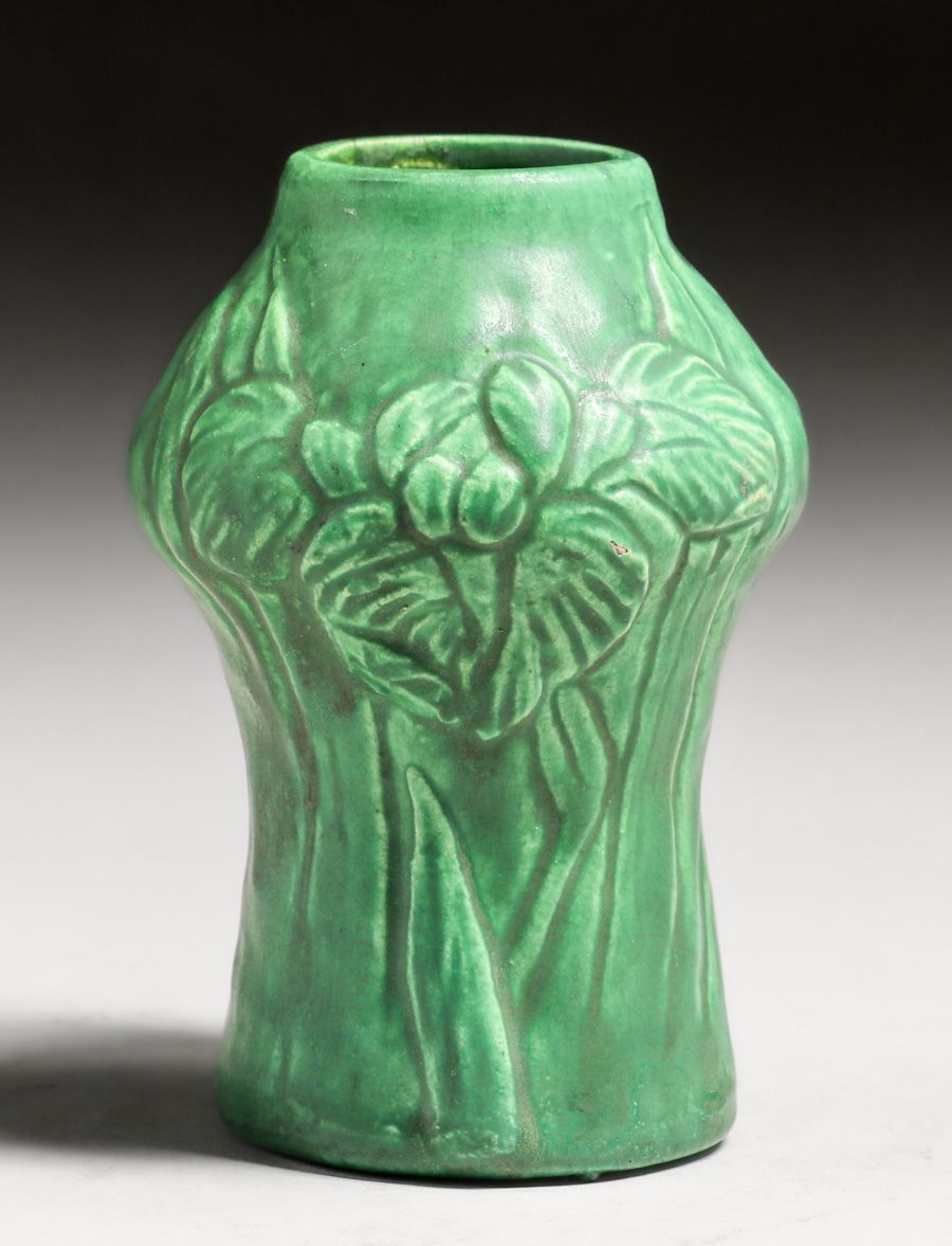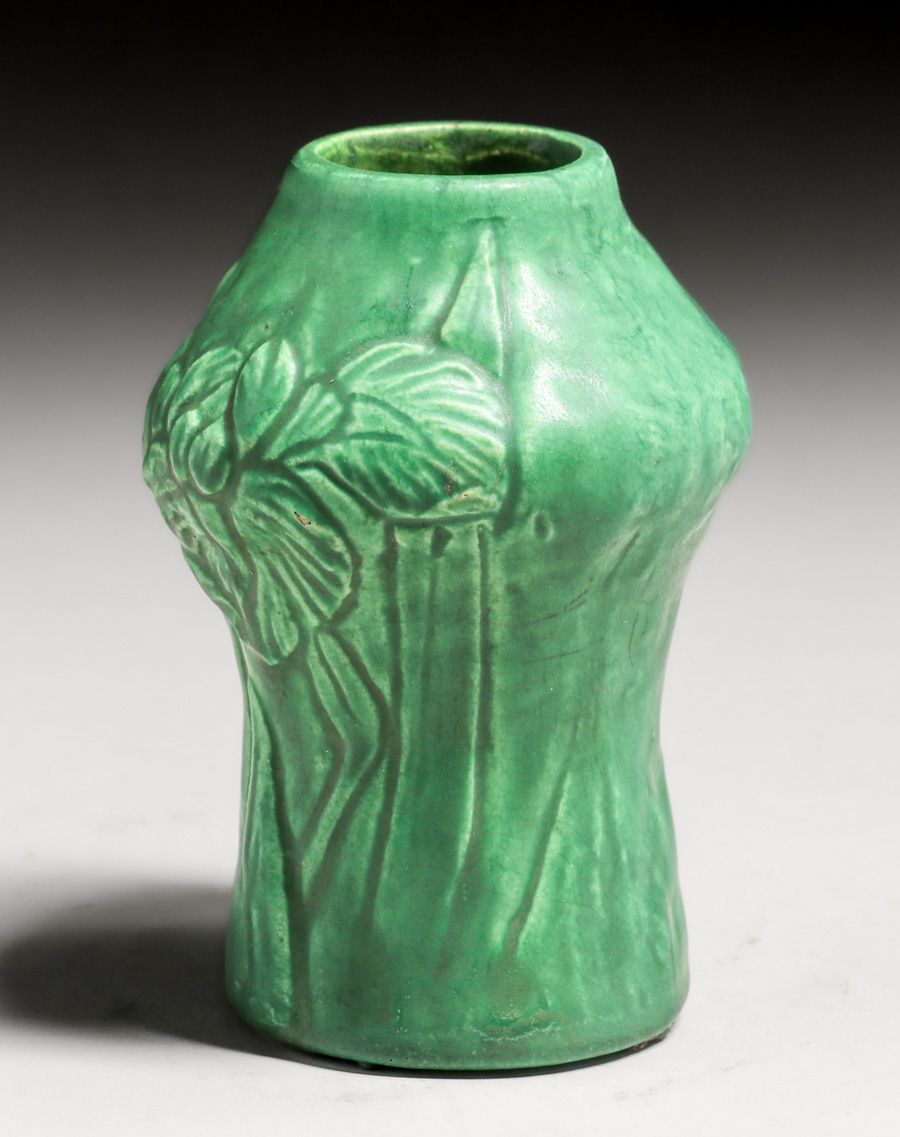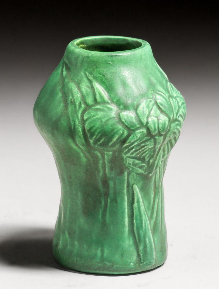 Cambridge Pottery Matte Green Vase c1910. Unsigned. Tiny fleck to surface of one flower, otherwise perfect condition. 5"h x 3"d $750