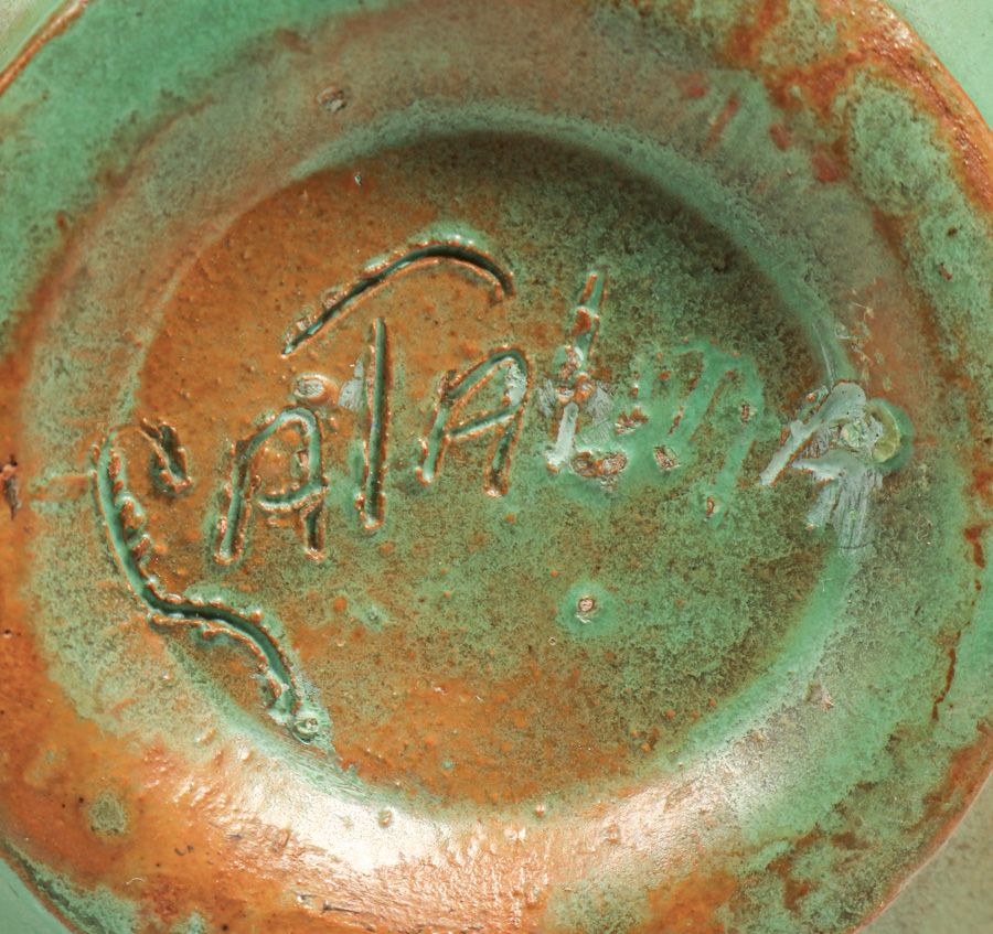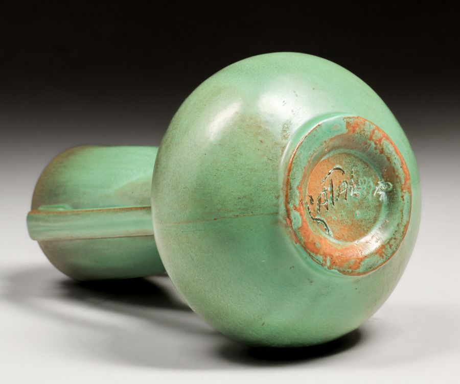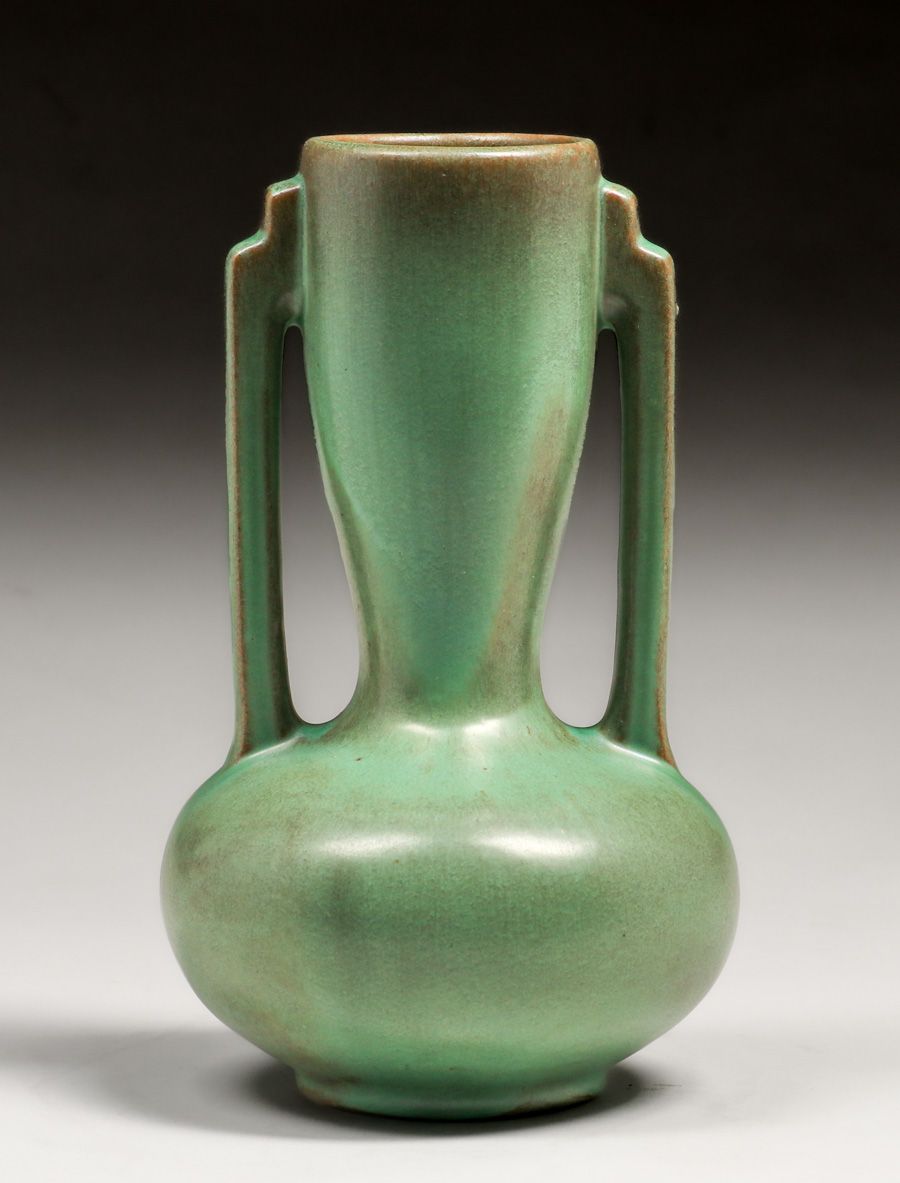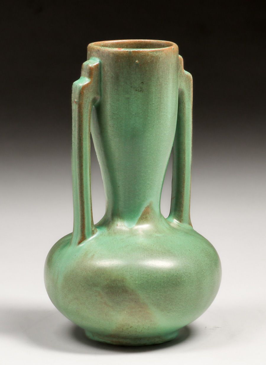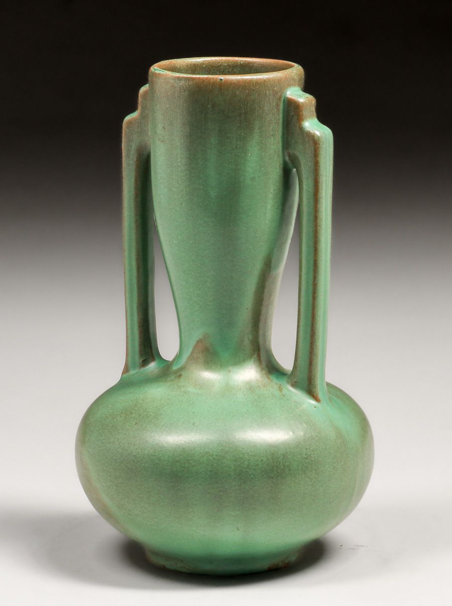 Catalina Island Matte Green Two-Handled Vase c1930. Signed. Perfect condition. 9″h x 5.25″d $1200