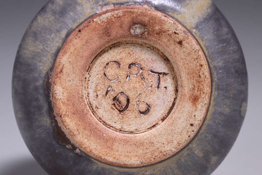 Chauncey R. Thomas vase with mustard drip glaze dated 1906, Alfred, NY. Thomas made this under the direction of Charles Binns and shows the influence of Binns upon the later glazes of California Faience and California Porcelain. Thomas started California Faience (The Tile Shop) in Berkeley in 1913. Invisible professional restoration to small rim chip, otherwise perfect condition. Incised "CRT '06". 6"h x 4"d SOLD