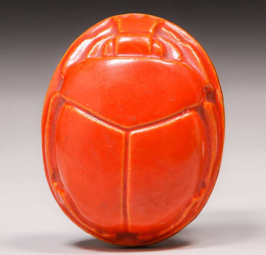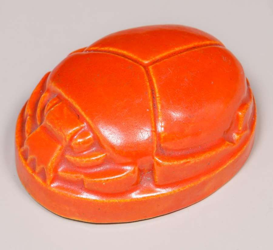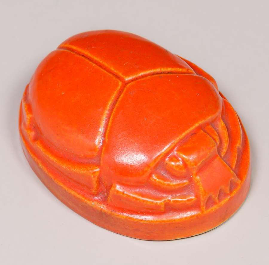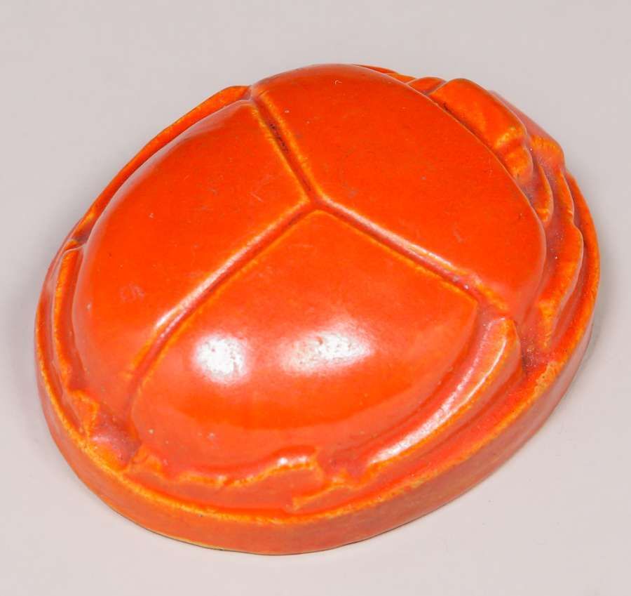 Claycraft Uranium Orange Scarab Paperweight c1920s. Signed. Perfect condition. 3″ x 2.5″ x 1.25″h SOLD