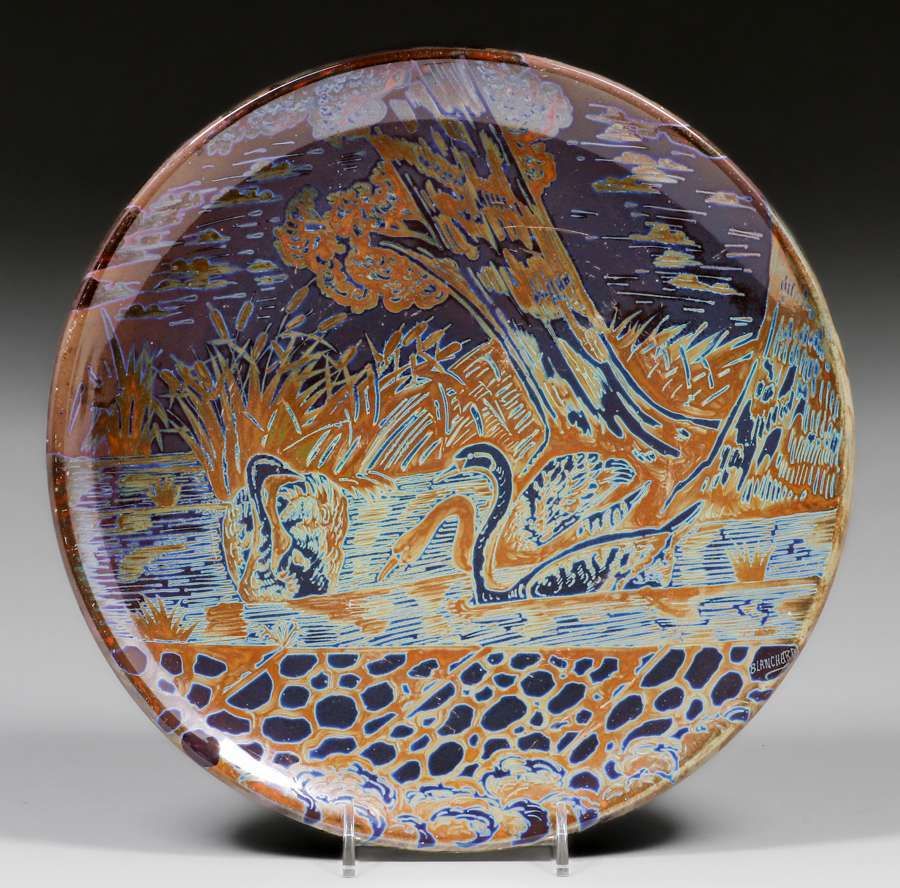 Jerome Massier (1850-1916) Iridescent Swans Charger c1894. Brother of Clement Massier. Artist signed "Blanchard". Invisible professional restoration to a few light surface scuffs otherwise perfect condition. 9.75"d SOLD