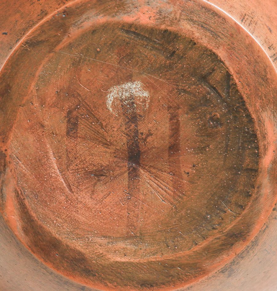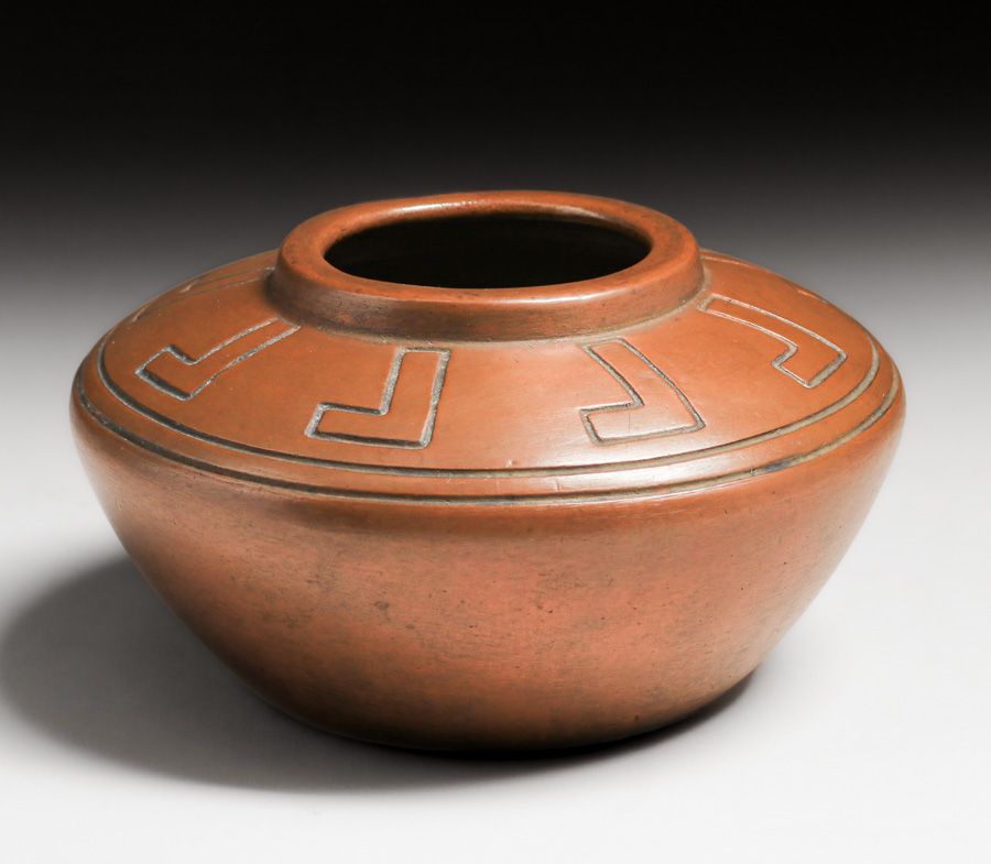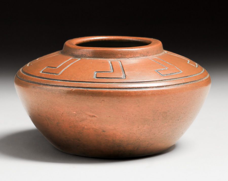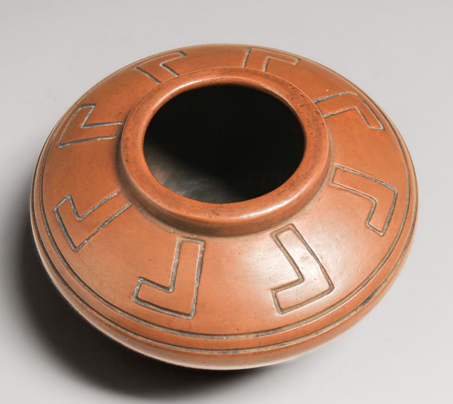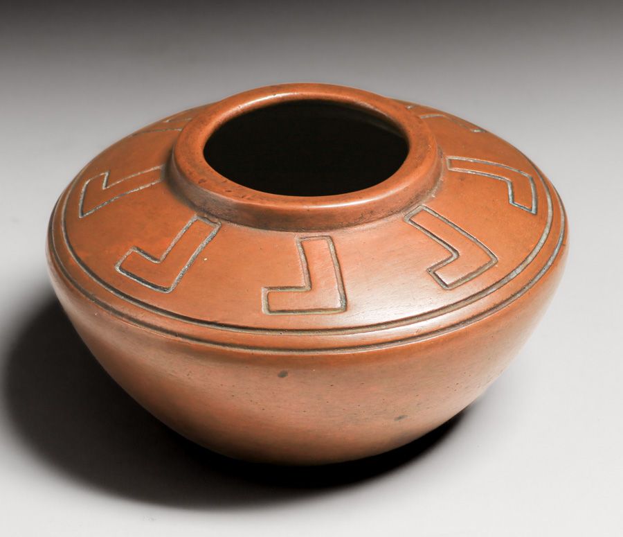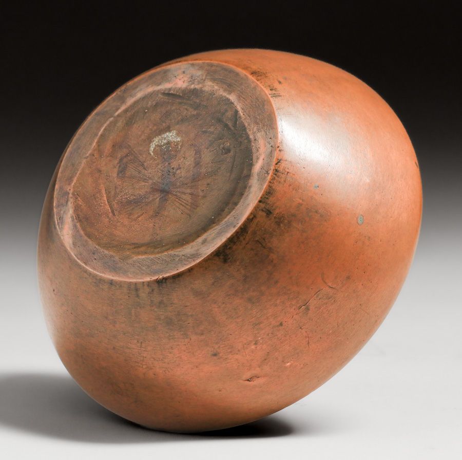 Clewell Copper-Clad Incised Owens Pottery Vase c1910. Unsigned. Excellent original patina. 6"d x 3"h $950