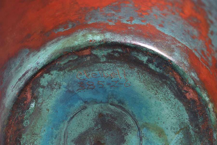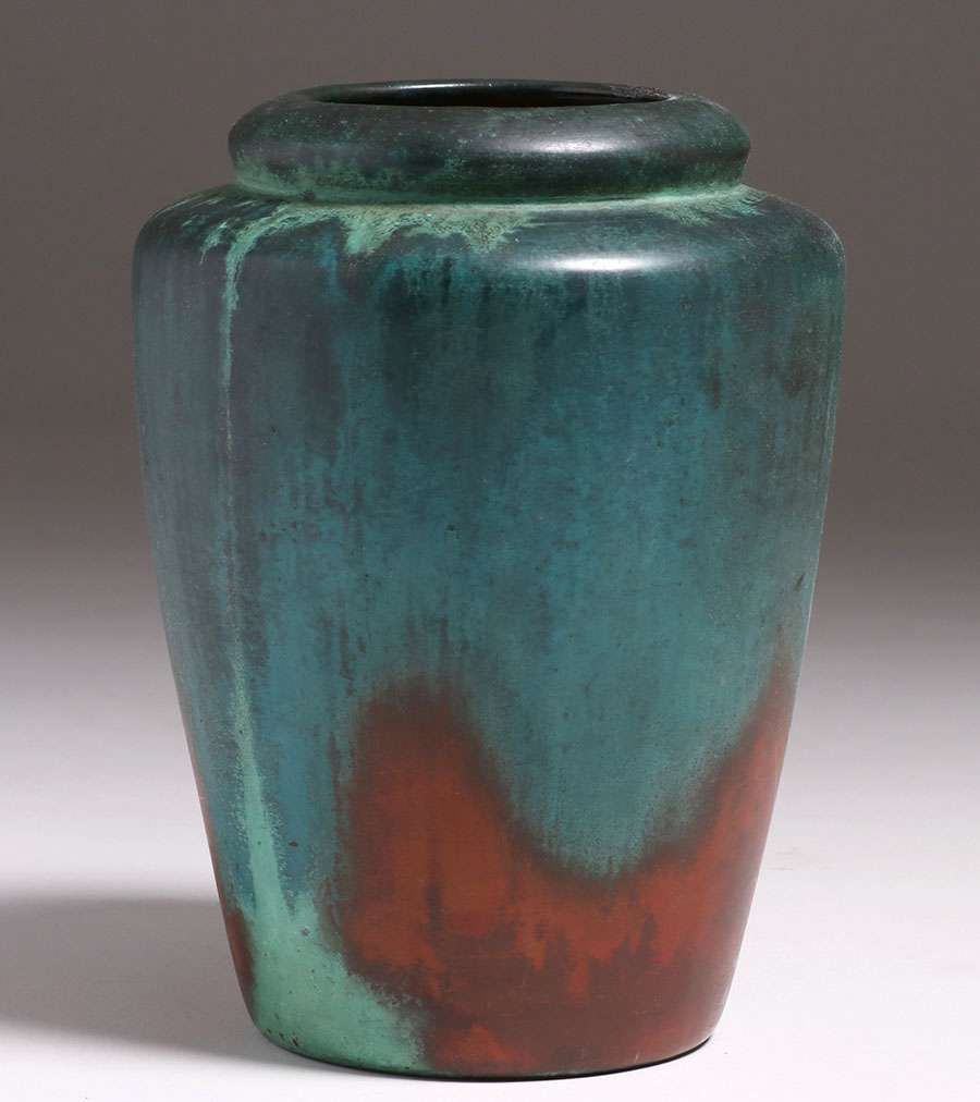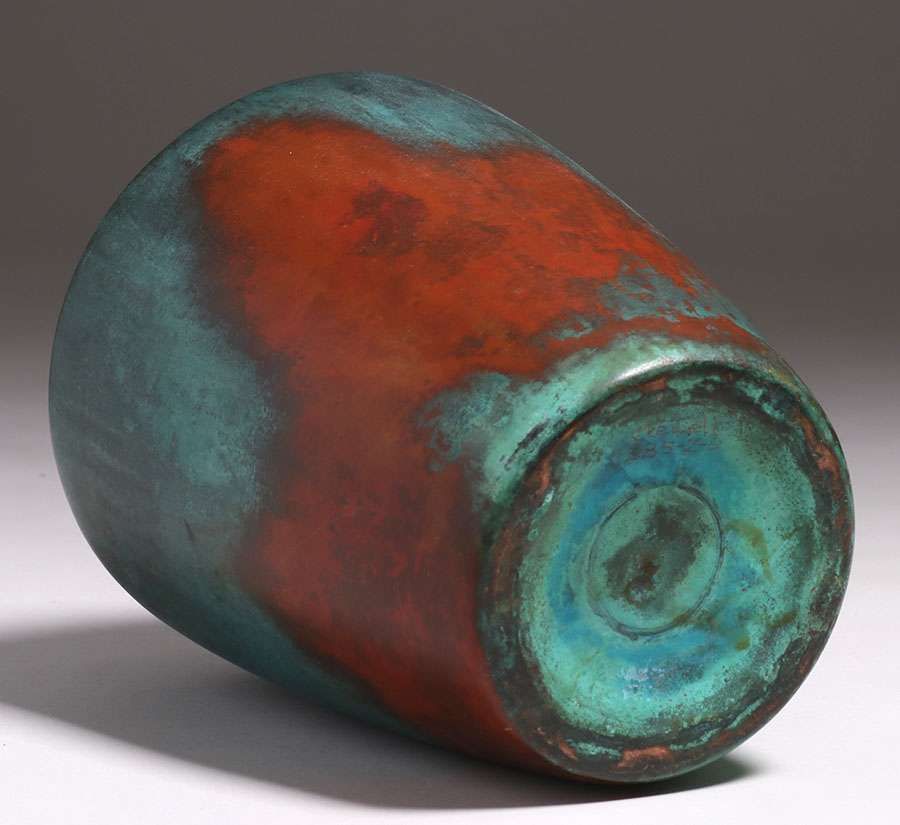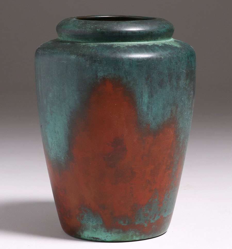 Clewell Copper-Clad Pottery Vase #385. Signed with inscribed signature. Excellent original patina. 11.5″h x 9″d SOLD