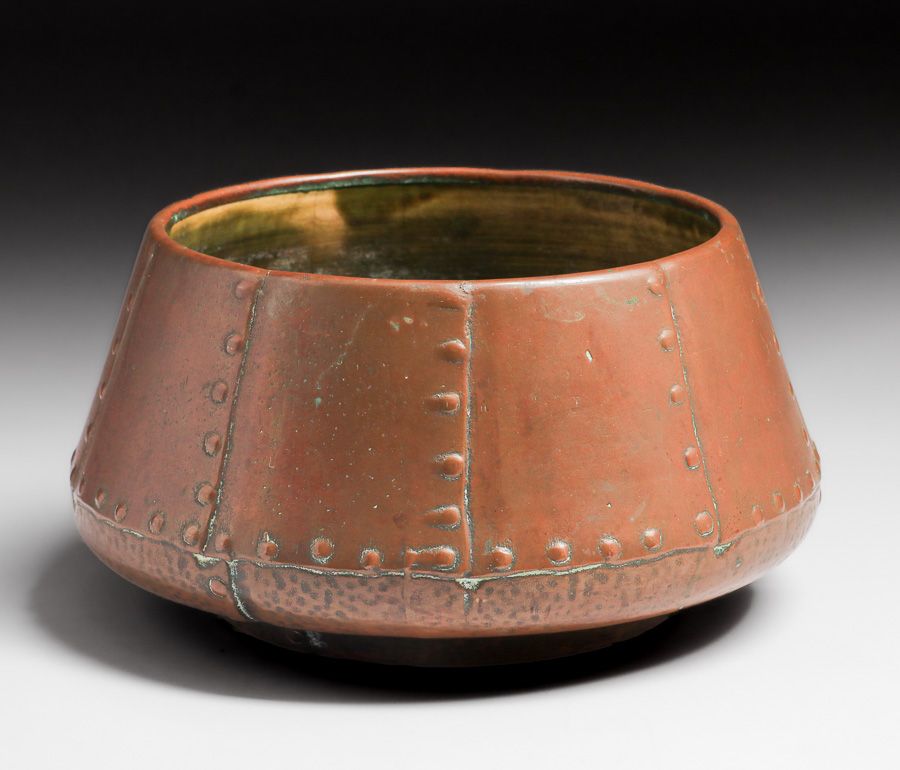 Clewell Copper-Clad Riveted Jardiniere c1910. Signed. Excellent original patina. 10"d x 5.25"h SOLD