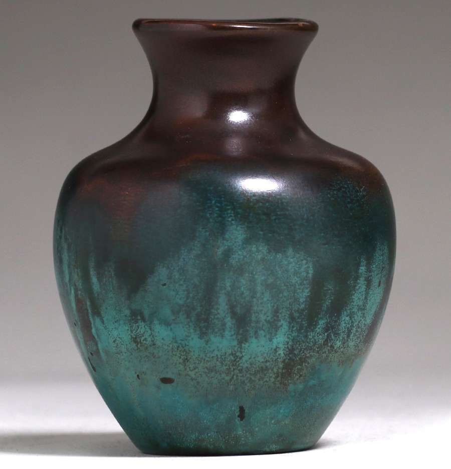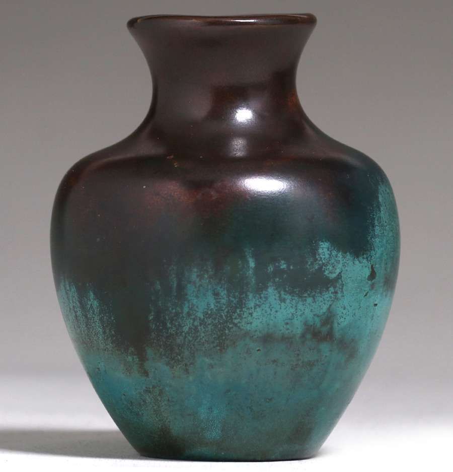 Clewell Copper-Clad vase #466. Signed with inscribed mark. Very light patina scuffs, overall excellent original patina. 4.5"h x 3.25"d SOLD