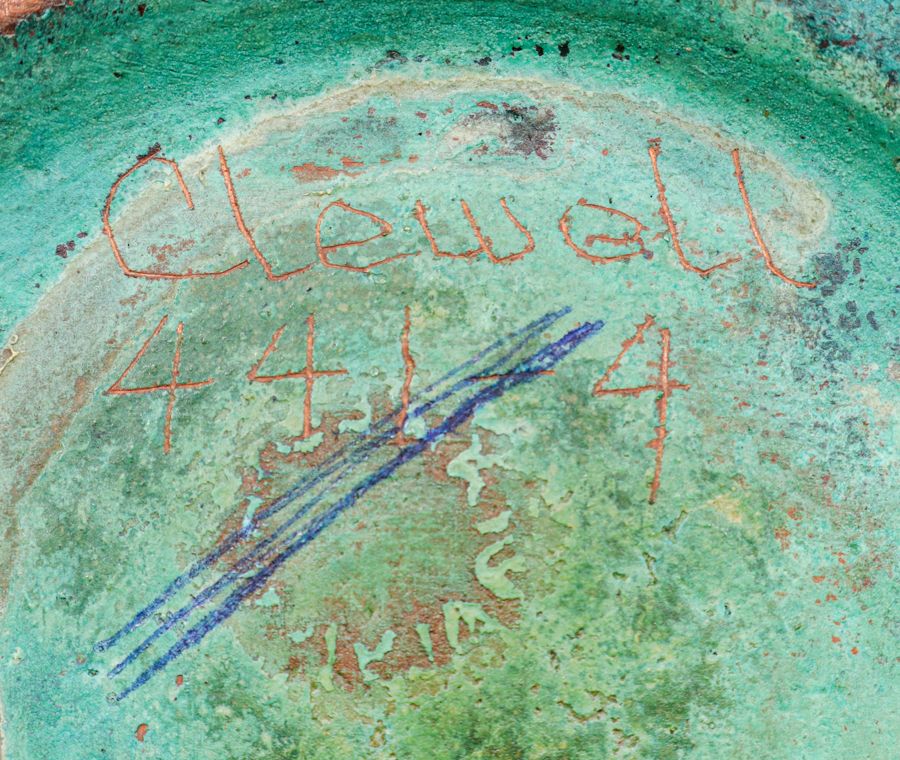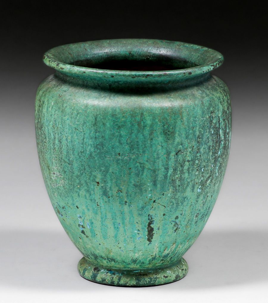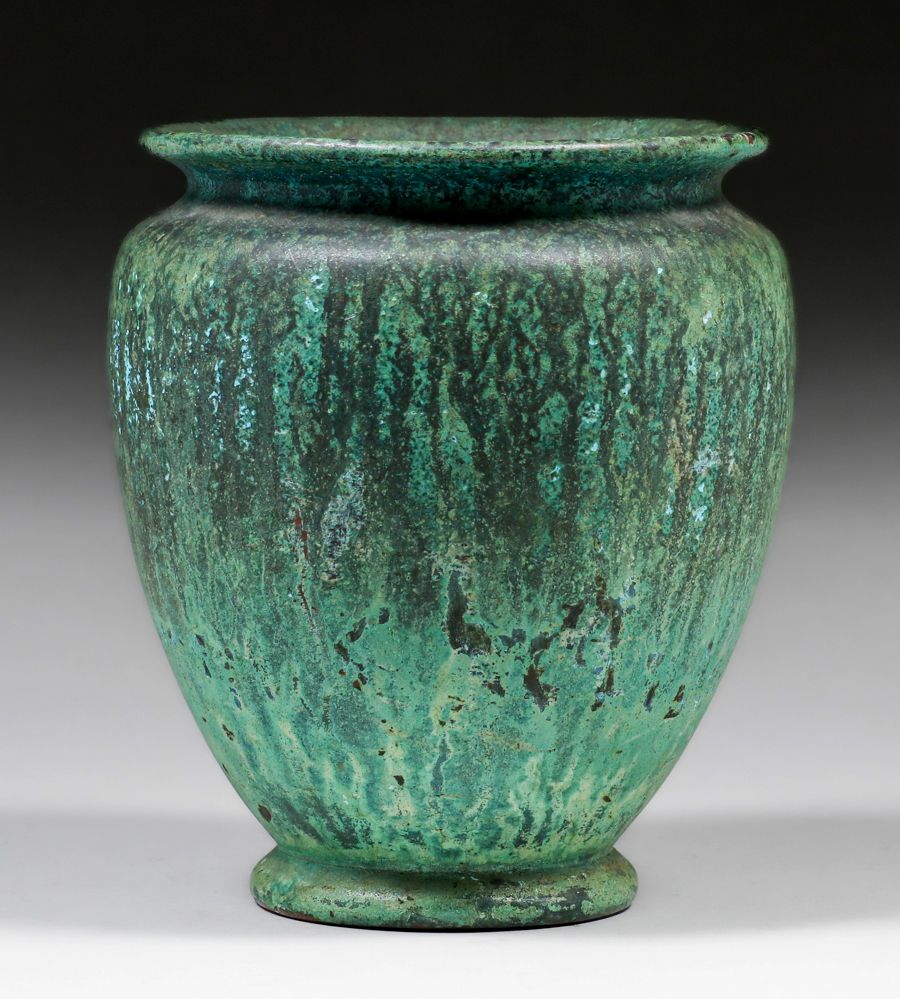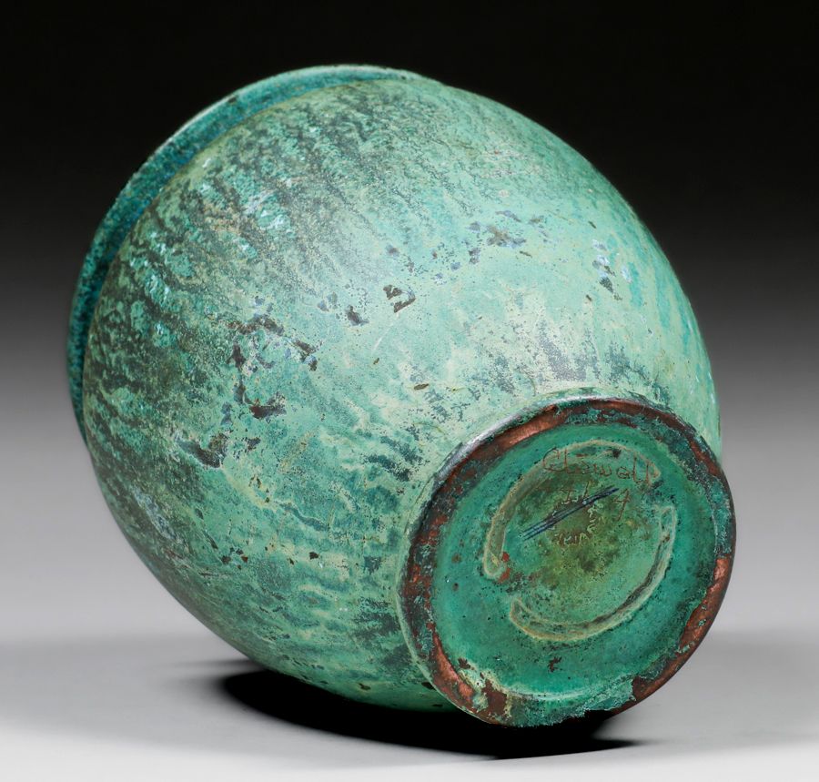 Clewell Copper-Clad Vase c1910. Signed. Some flaking to fantastic original verdigris green drip patina. 7”h x 6”d SOLD