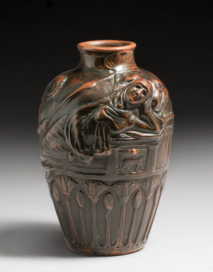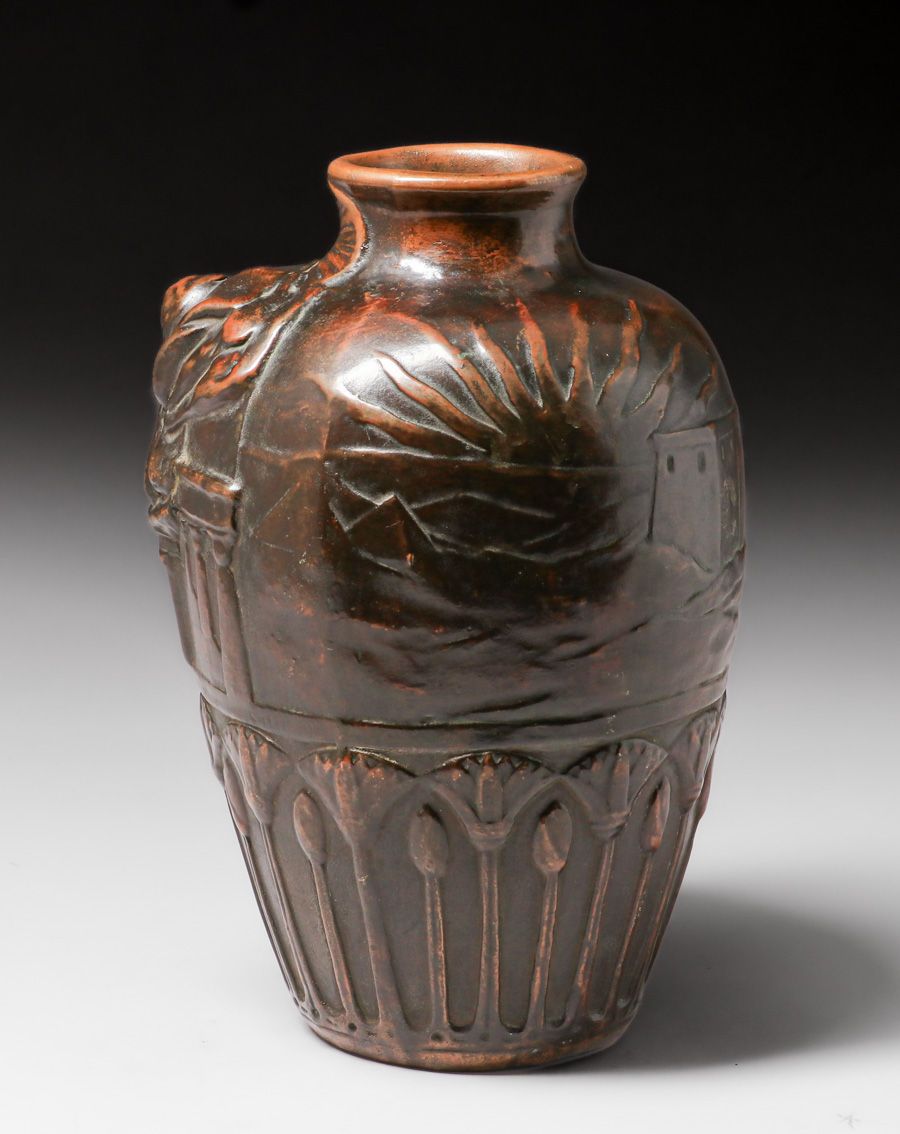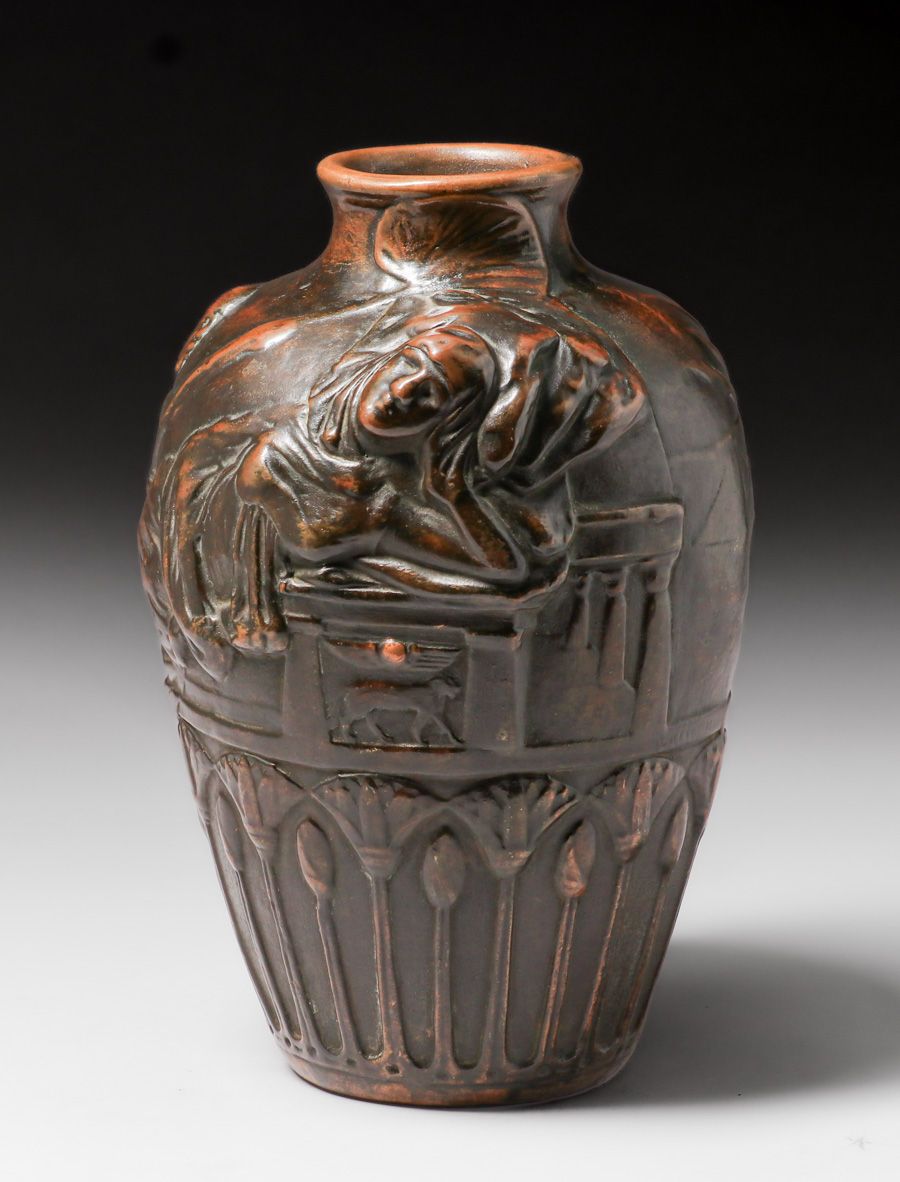 Weller Pottery – Clewell Copper-Clad figural Vase c1920s. Weller L’Art Nouveau form with Egyptian Revival theme. Signed. Perfect condition. Excellent original patina. 12.5″h x 8″d