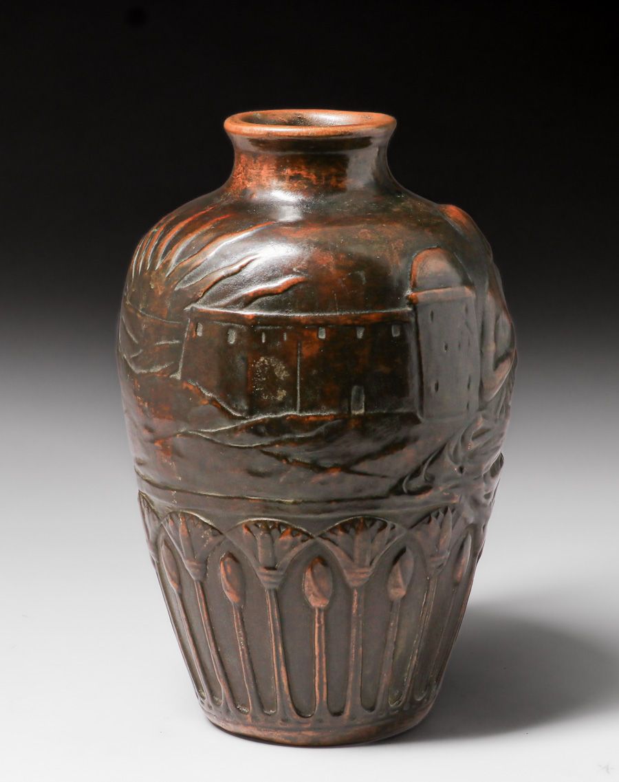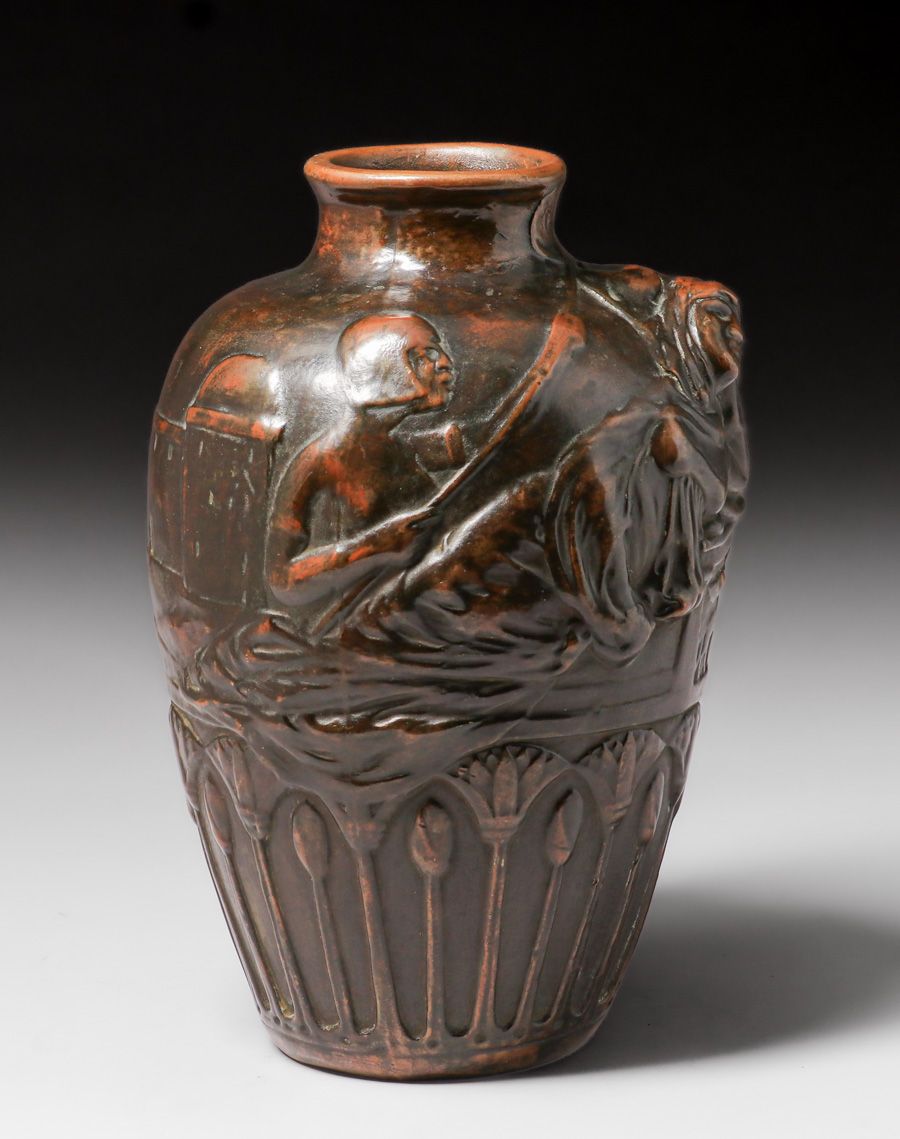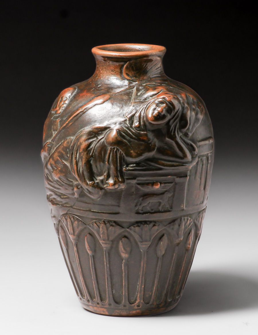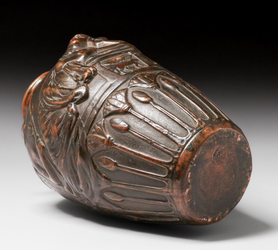 Weller Pottery – Clewell Copper-Clad figural Vase c1920s. Weller L’Art Nouveau form with Egyptian Revival theme. Signed. Perfect condition. Excellent original patina. 12.5″h x 8″d