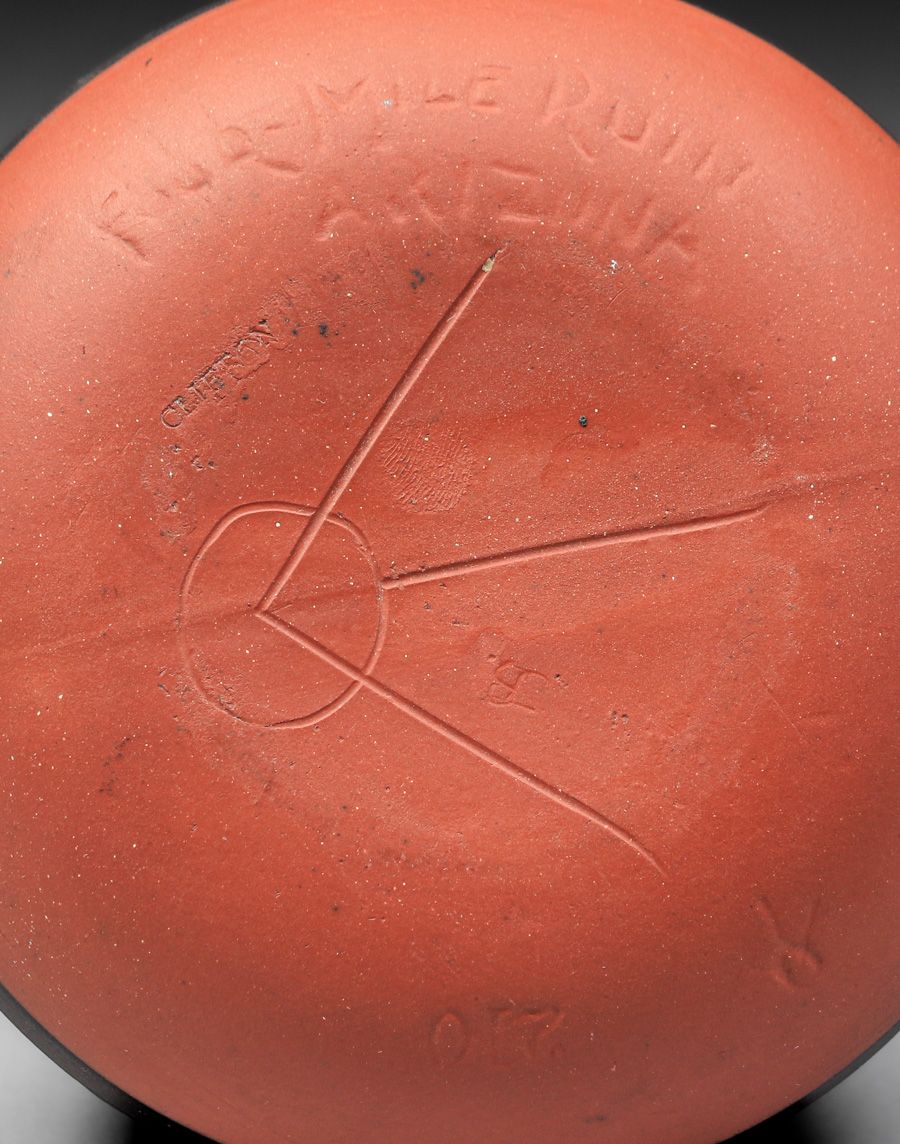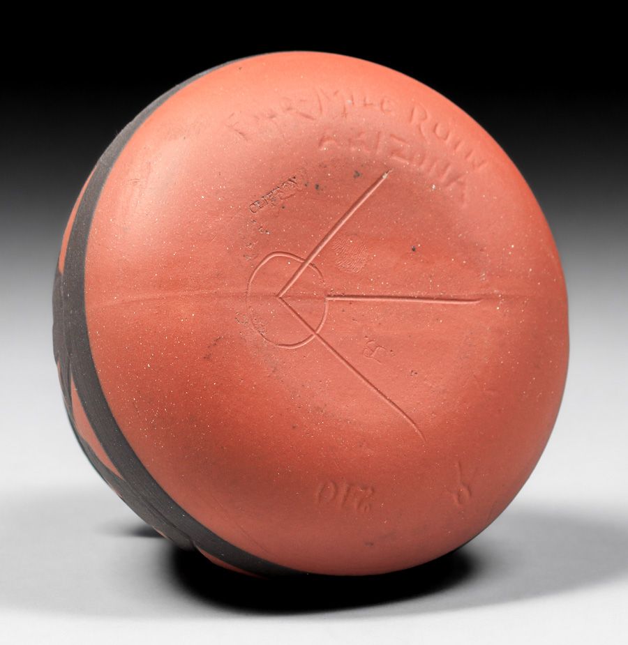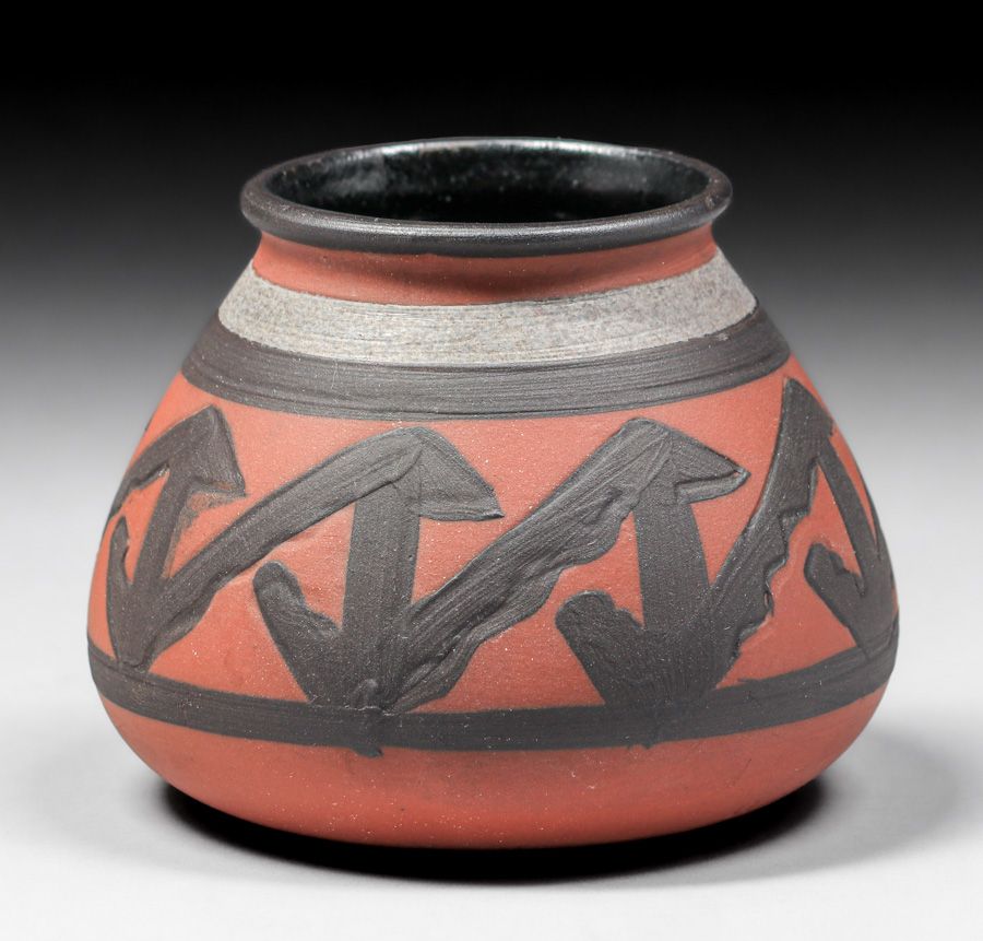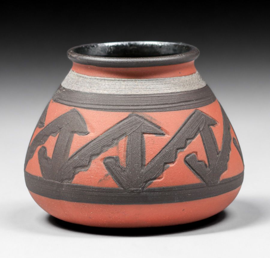 Clifton Pottery #210 Indianware Vase c1910. Signed. Marked "Four Mile Ruin, Arizona". Perfect condition. 3.5"h x 4"d $650