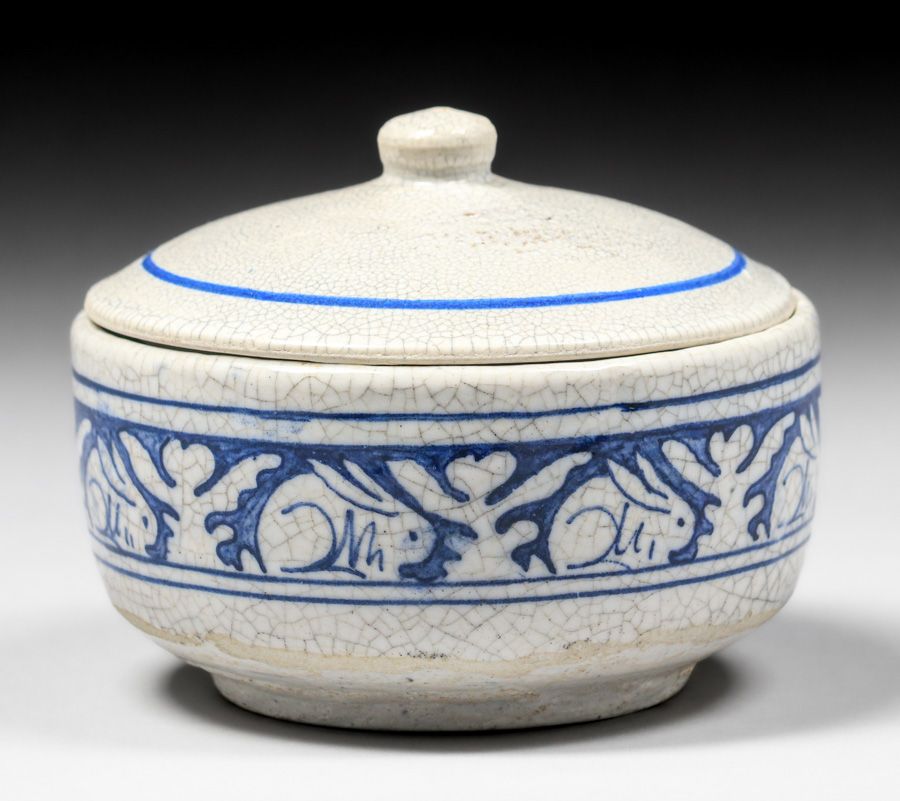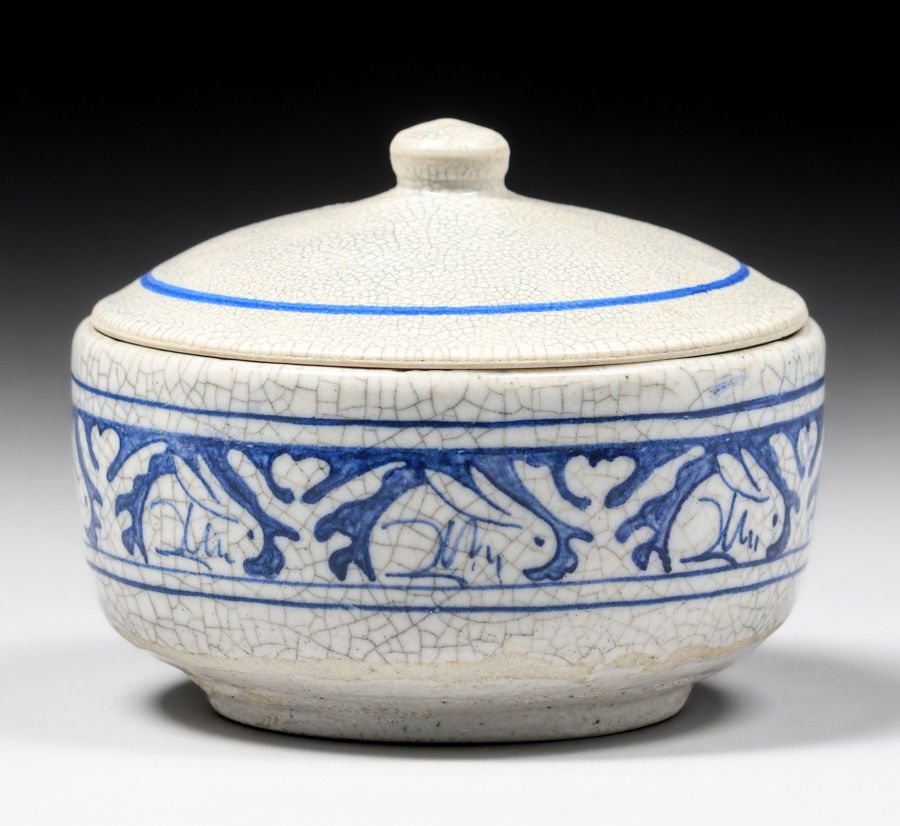 Dedham Pottery Bunny Rabbit Marmalade Jar c1920s. Signed. Perfect condition. 4 5/8"d x 3 5/8"h SOLD
