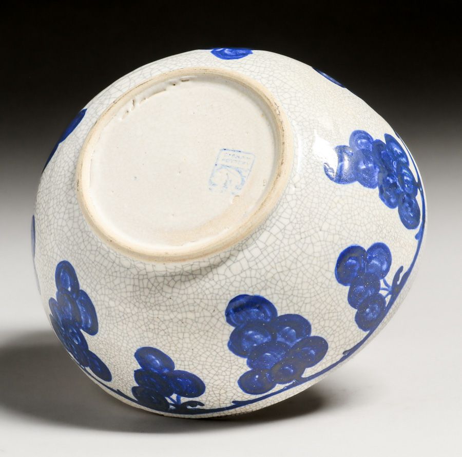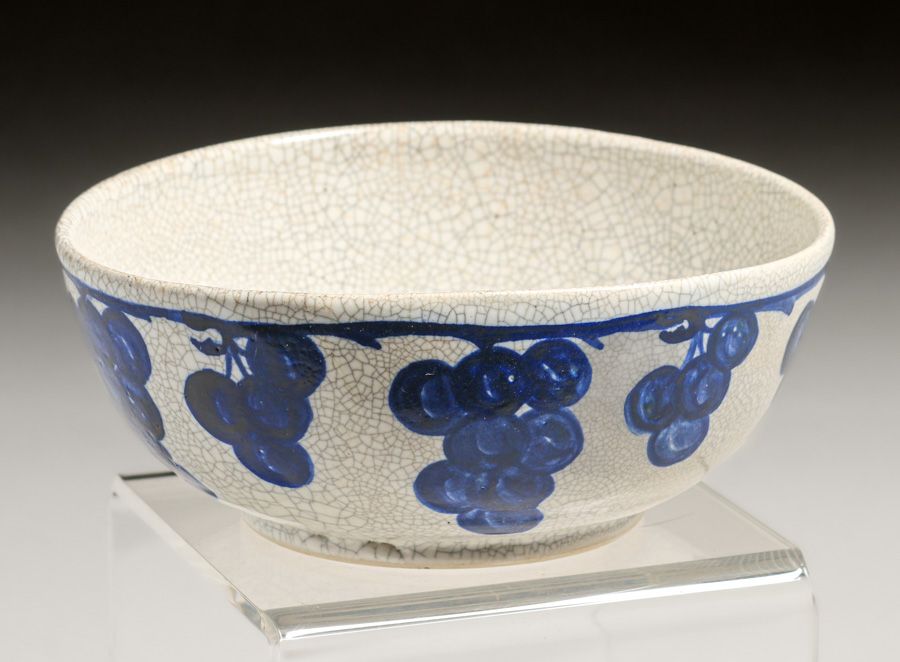 Large Dedham Pottery Grapevine Fruit Bowl c1920s. Signed. Rim out-of-round, otherwise perfect condition. 8"d x 3.5"h SOLD