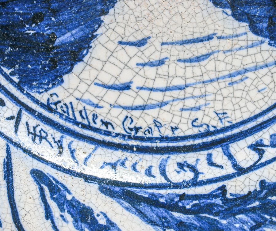 Rare Dedham Pottery Hugh Robertson Golden Gate, San Francisco Plate c1898-1908. Signed. Invisible professional restoration to two small edge chips, otherwise perfect condition. 10"d SOLD