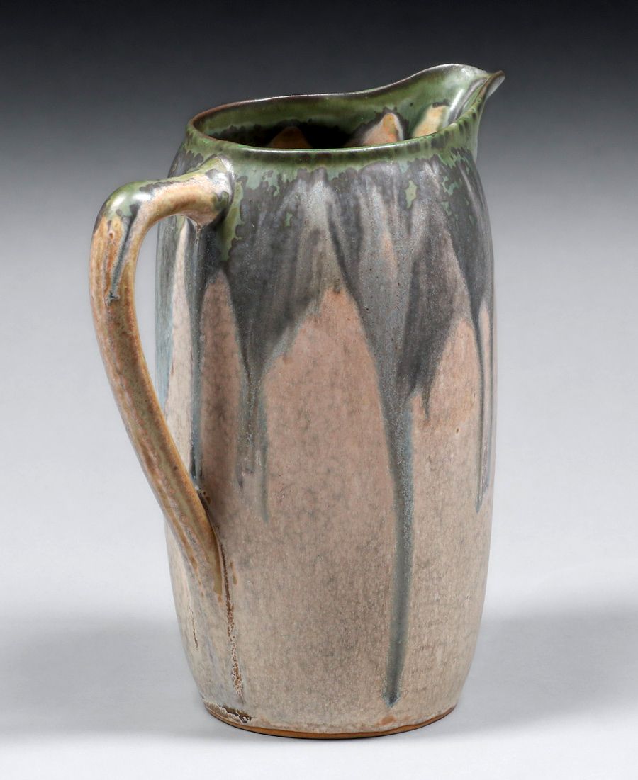 - Denbac Pottery - French Microcrystalline Green & Grey Drip Pitcher c1910s