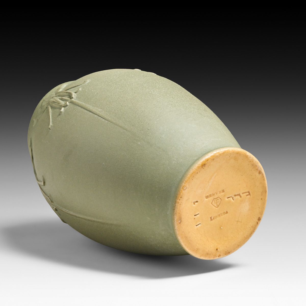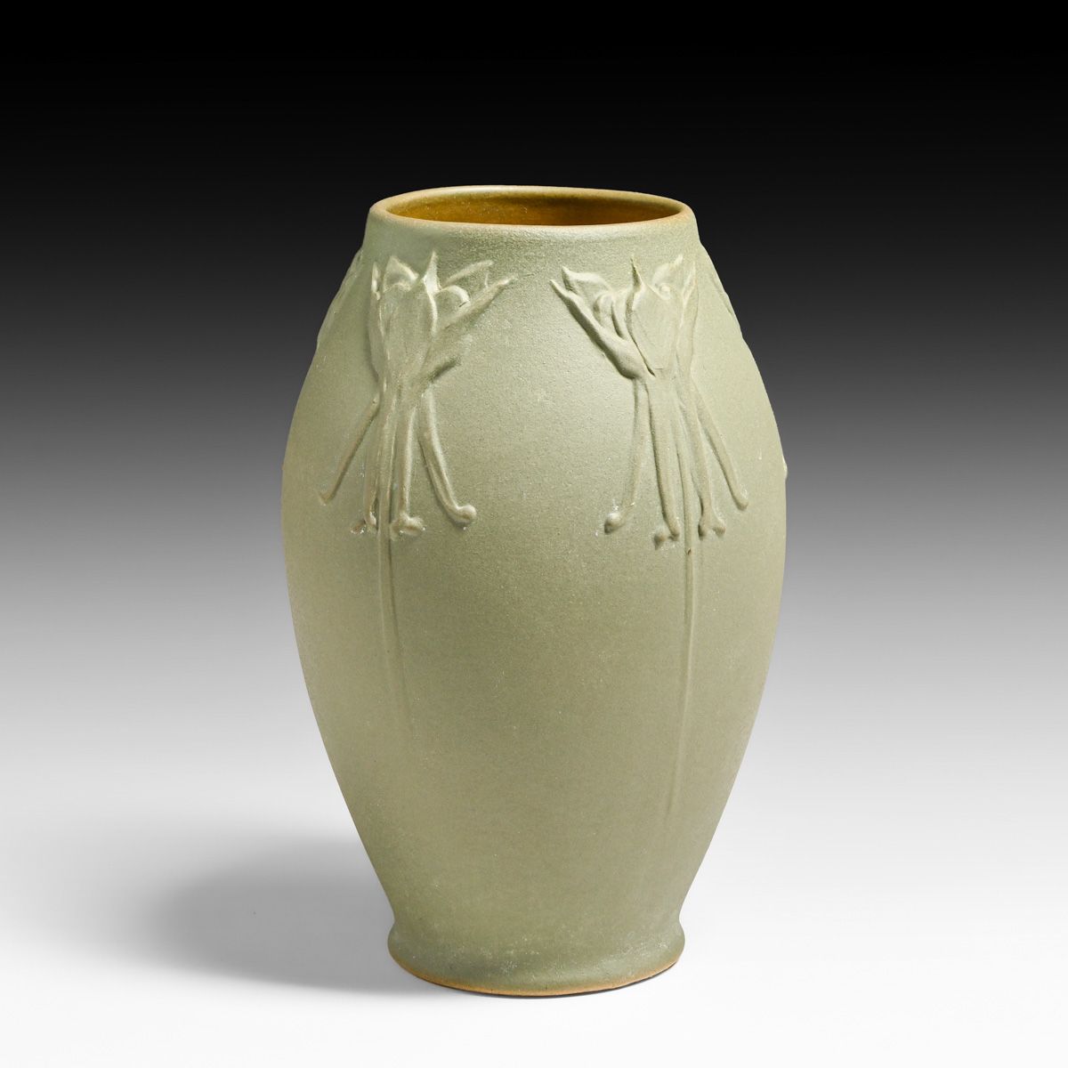 Denver Lonhuda Carved Tulip Vase c1905. Signed. Invisible professional restoration to tight hairline, otherwise perfect condition. 7.75"h x 5"d