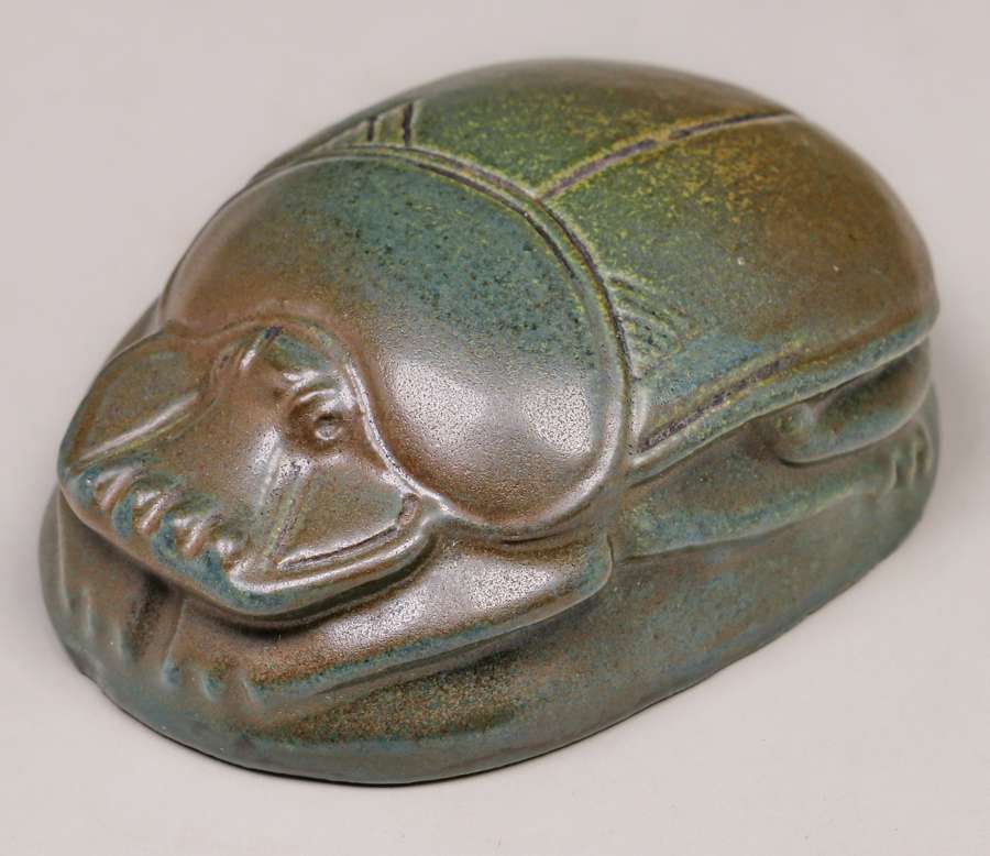 Denver Terra Cotta Co Matte Green Scarab Paperweight c1910. Signed. Invisible professional restoration to two small edge chips, otherwise perfect condition. 3.75" x 2.75"w x 1.5"h SOLD