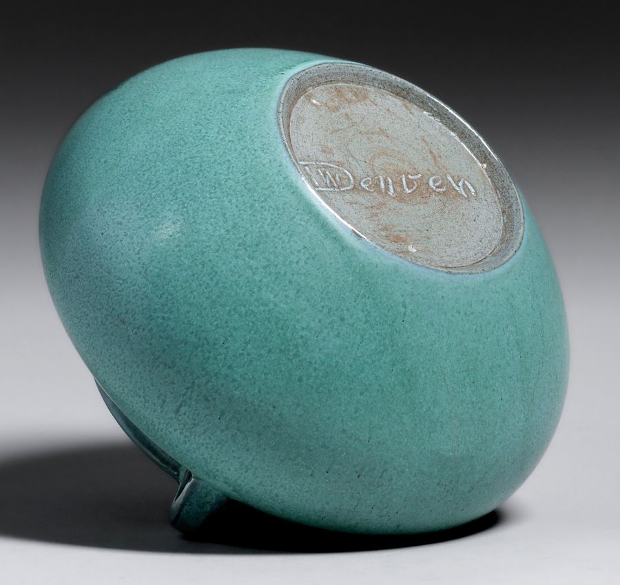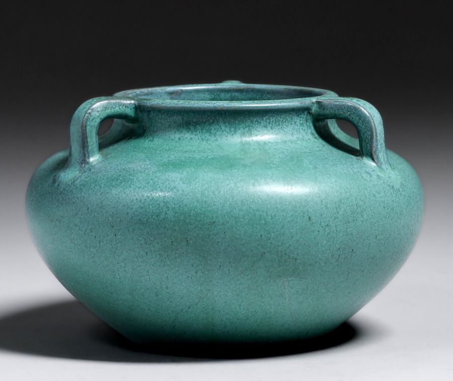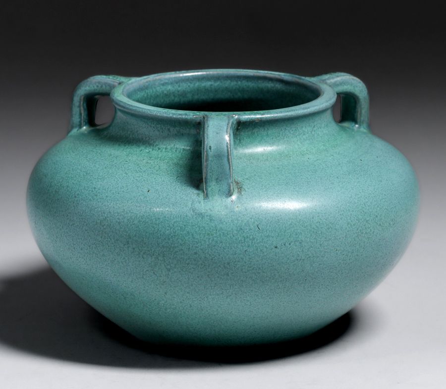 Denver White Pottery Matte Blue Three-Handled Vase c1910s. Signed. Perfect condition. 6.75d x 4.5h inches SOLD